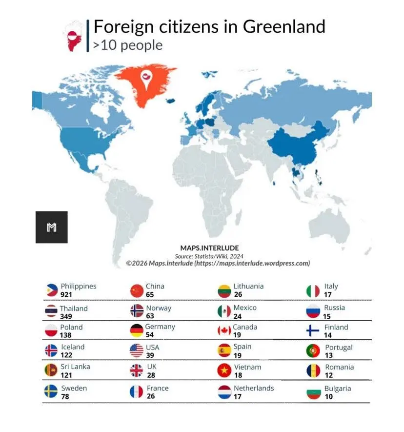 จากภาพสถิติของเว็บไซต์ Brilliant Maps ซึ่งอ้างอิงข้อมูลล่าสุด แสดงจำนวนชาวต่างชาติที่อาศัยอยู่ในกรีนแลนด์แยกตามสัญชาติ โดยนับเฉพาะประเทศที่มีจำนวนมากกว่า 10 คน พบว่า คนไทยอยู่ในอันดับต้น ๆ ของกลุ่มชาวต่างชาติทั้งหมด