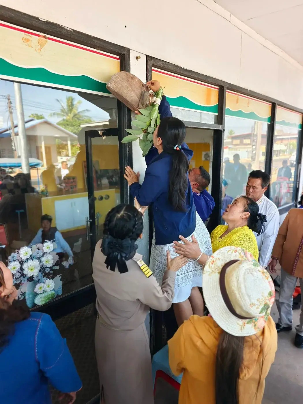 เมื่อมาถึงก็จะมอบให้กับผู้ใหญ่บ้านคนใหม่นั้นเป็นคนผูก ตอนปลดลงนั้นก็คือผู้ใหญ่บ้านคนก่อน และให้ผู้ใหญ่ประจำของหมู่บ้านที่นับถือนั้นต้อนรับกะลอ และจะมัดในส่วนของใบคูณใบยอ เพื่อเพิ่มในส่วนของสิริมงคลให้
