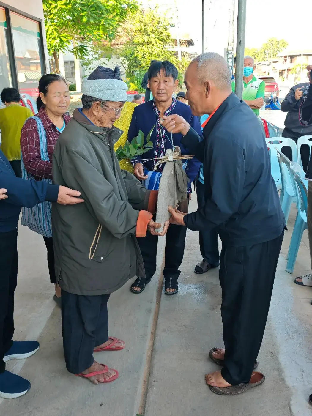การรับมอบกะละที่จะมัดและนำพาจะต้องมีปู่ตาที่บ้านเรานั้นเคารพมาให้พร และพูดเพื่อโน้มน้าวและจะมาเพื่อที่จะพรมน้ำหอม จากนั้นส่งมอบ ถือว่าศักดิ์สิทธิ์ที่สุดแล้ว ไม่มีในส่วนของพิธีสงฆ์