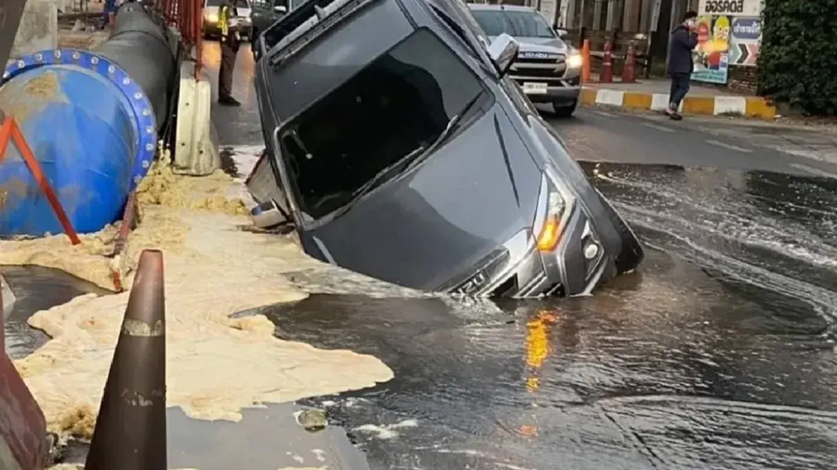 เลขเด็ดทะเบียนรถ! กระบะตกหลุมยักษ์พระราม 2 หลังถนนทรุดตัวฉับพลันหน้าห้างดัง