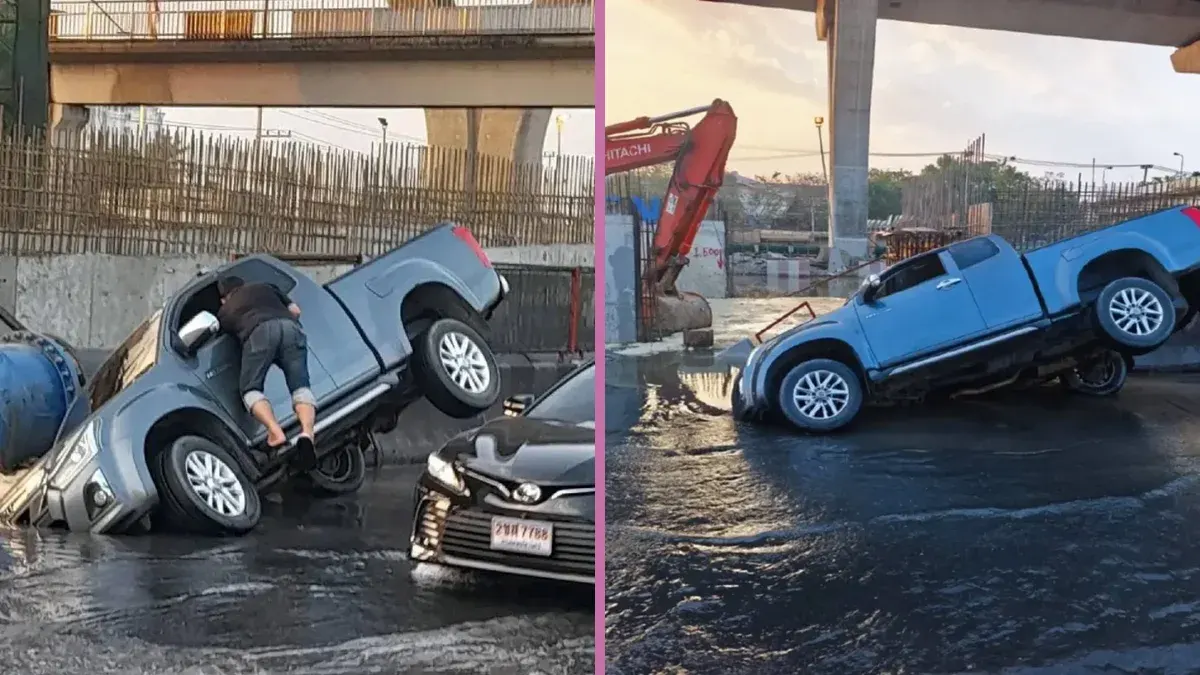 ระทึกพระราม 2! กระบะตกหลุมยักษ์กลางถนน หลังผิวจราจรทรุดตัวฉับพลัน