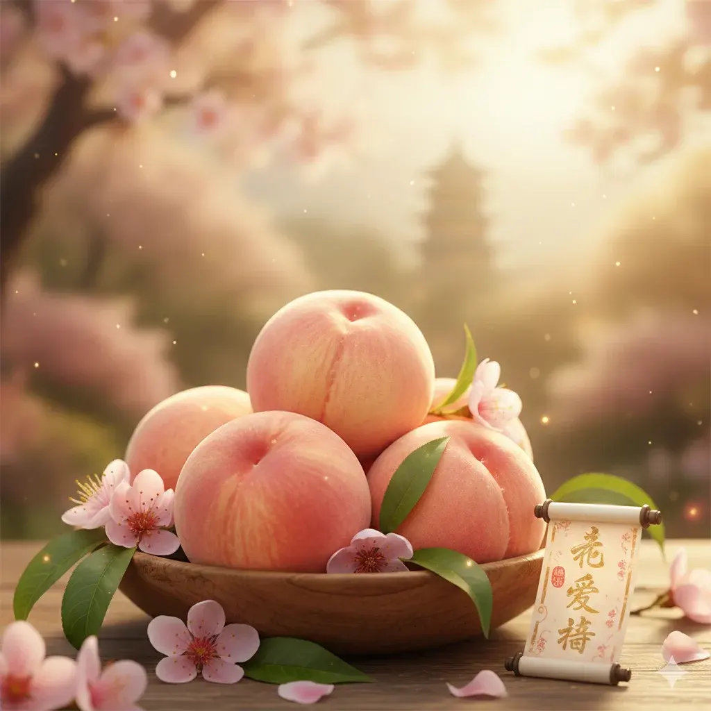 สัญลักษณ์แห่งความอมตะ: ตามตำนานจีน "ซีหวังหมู่" หรือพระแม่ตะวันตก ทรงมีสวนท้อสวรรค์ที่ออกผลทุกๆ 3,000 ปี ใครที่ได้ลิ้มรสจะกลายเป็นอมตะและมีอายุนับหมื่นปี ลูกพีชจึงเป็นตัวแทนของการมีอายุยืนยาว (Longevity)