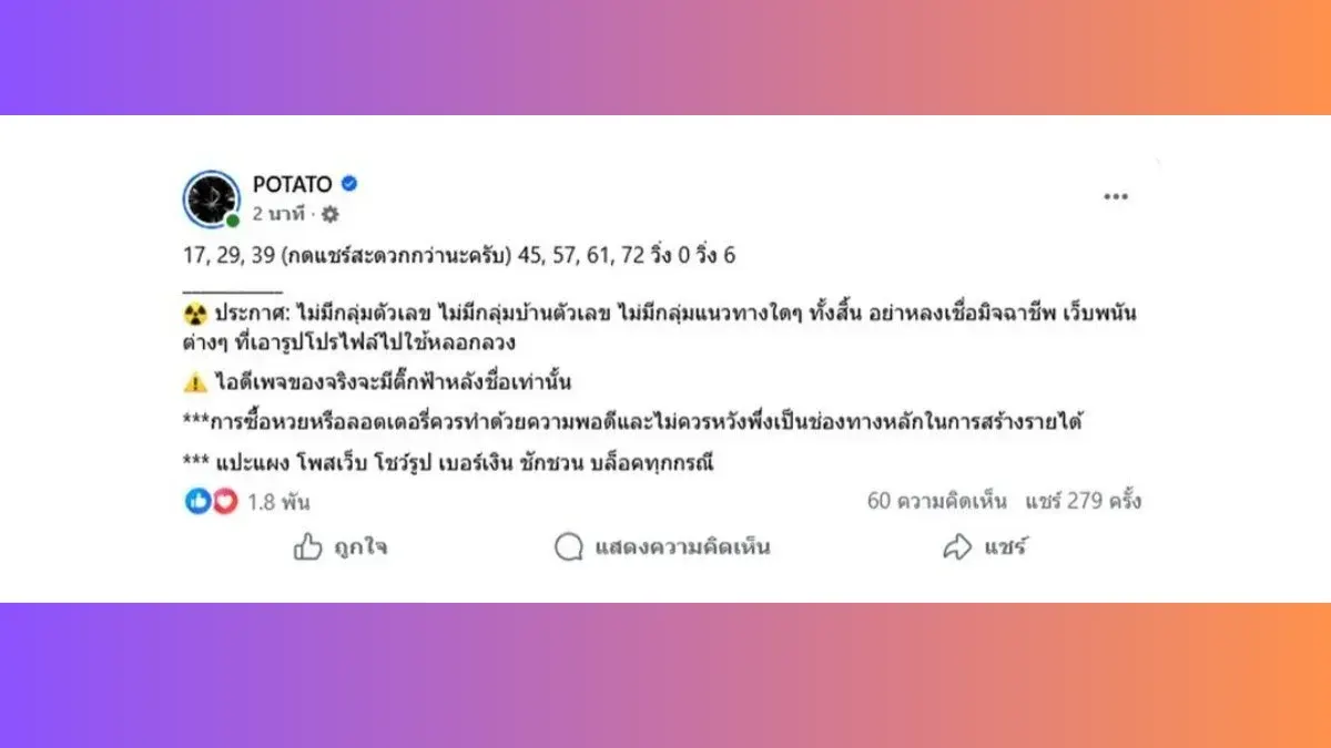 โซเชียลแห่แชร์! เพจ POTATO แจกแนวเลขเด็ด พร้อมคำเตือนระวังมิจฉาชีพแอบอ้าง