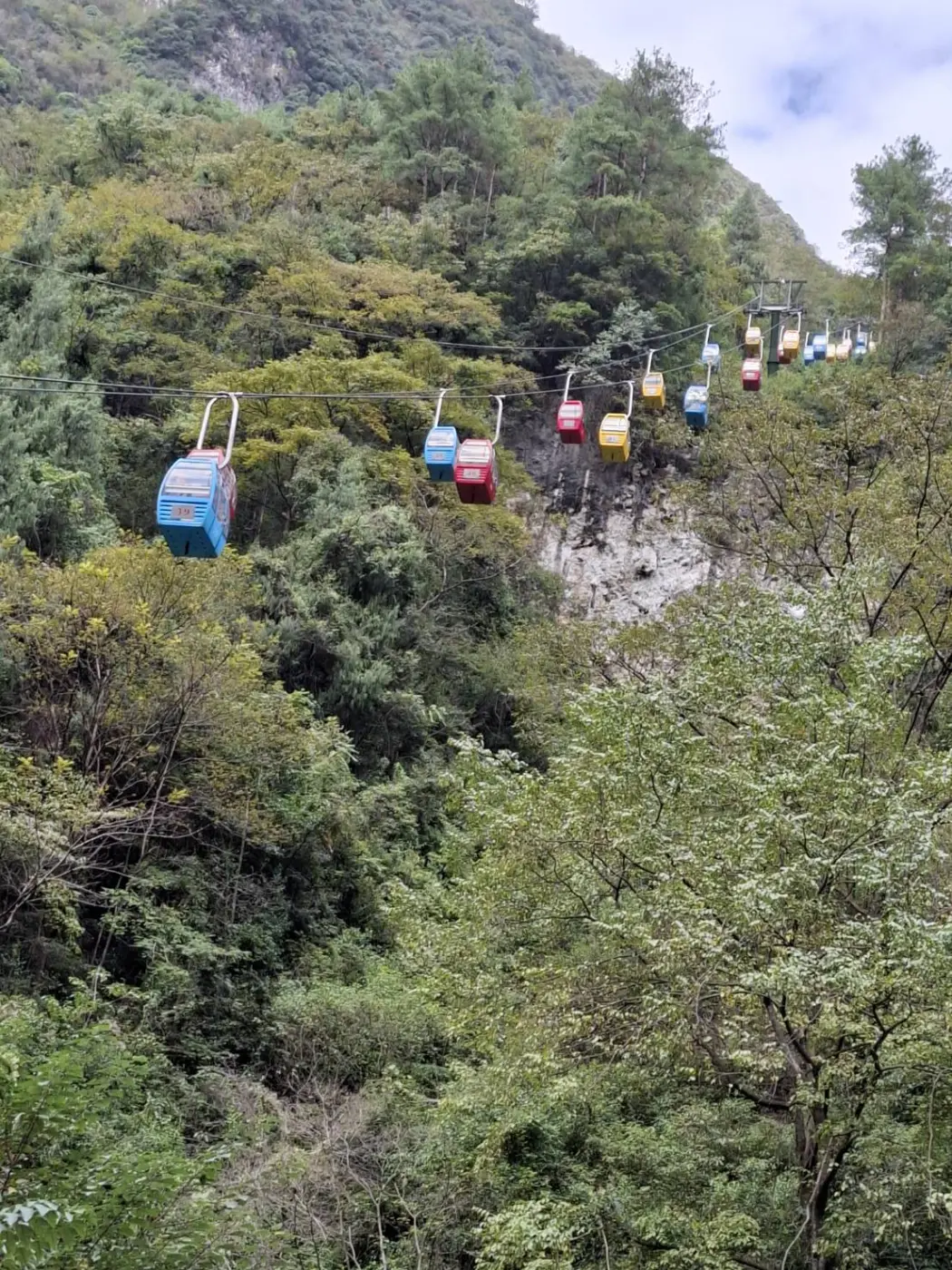 เราจะนั่งไป 4 คน ต่อ 1 กระเช้า แต่ละกระเช้าก็มีหลากหลายสีค่ะ ใช้เวลาสักพักเลยค่ะ พอถึงแล้ว เราก็ต้องเดินไปอีกค่ะ เดินมากจริงๆ ระยะทางก็พอสมควรเลยทีเดียว (จำวันที่เราไปเขาหลุมฟ้าได้มั้ยคะ วันนั้นเดินราวๆ 6 กิโลเมตร และวันนี้จะประมาณ 2 กิโลเมตร แต่ความรู้สึกแตกต่างกันโดยสิ้นเชิง โดยเฉพาะคนกลัวความสูง) ระหว่างทางที่เดินไป ก็ชมวิวทิวทัศน์ไปเรื่อยๆ ค่ะ สวยงามต้นไม้เยอะ เพราะมันอยู่หุบเขาล่าง แต่..ยังไม่ล่างสุดนะคะ