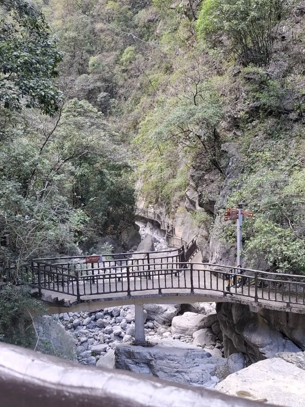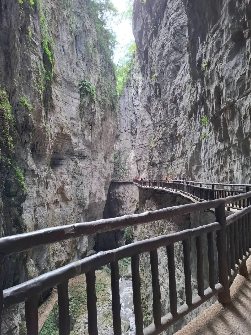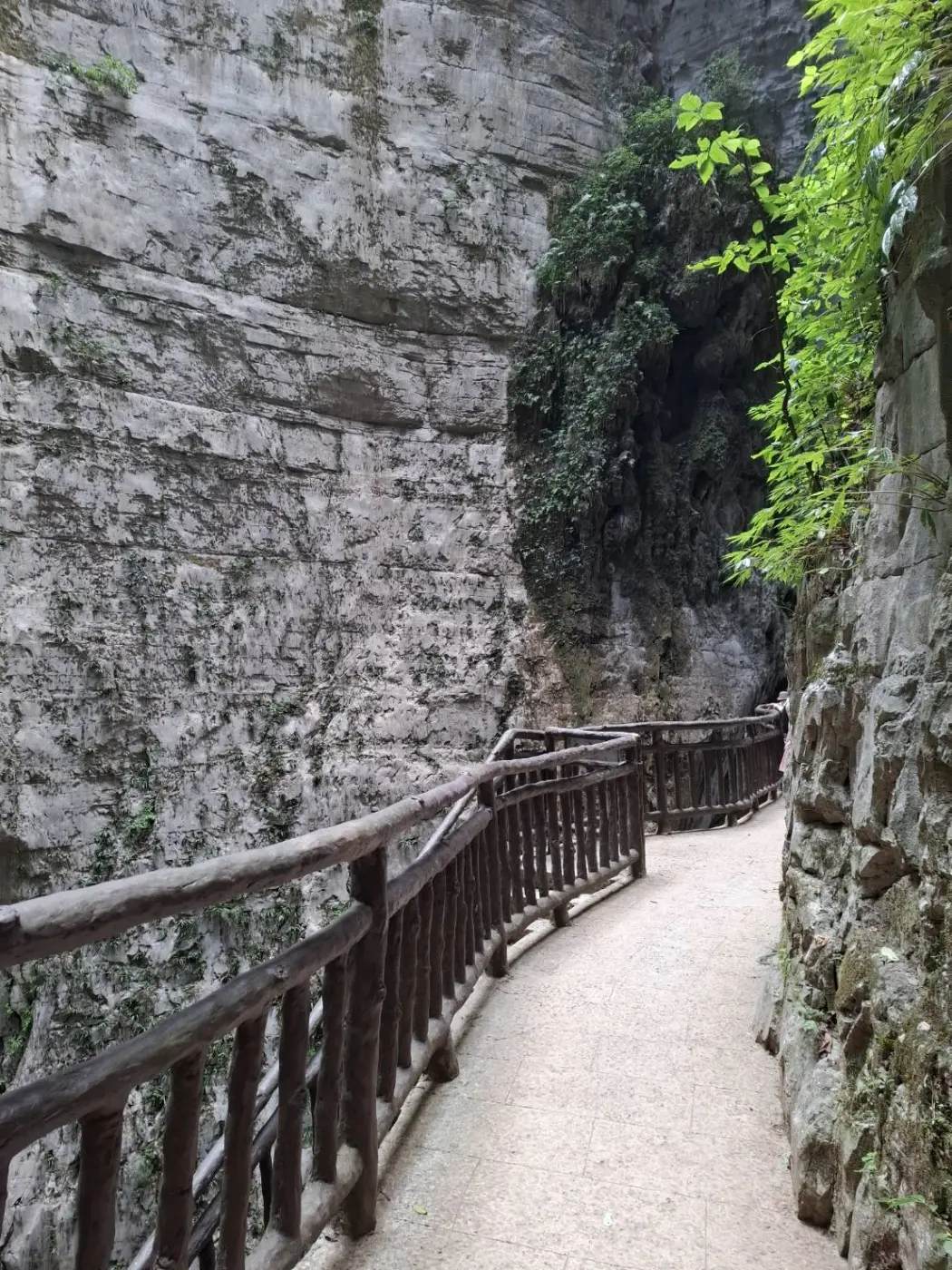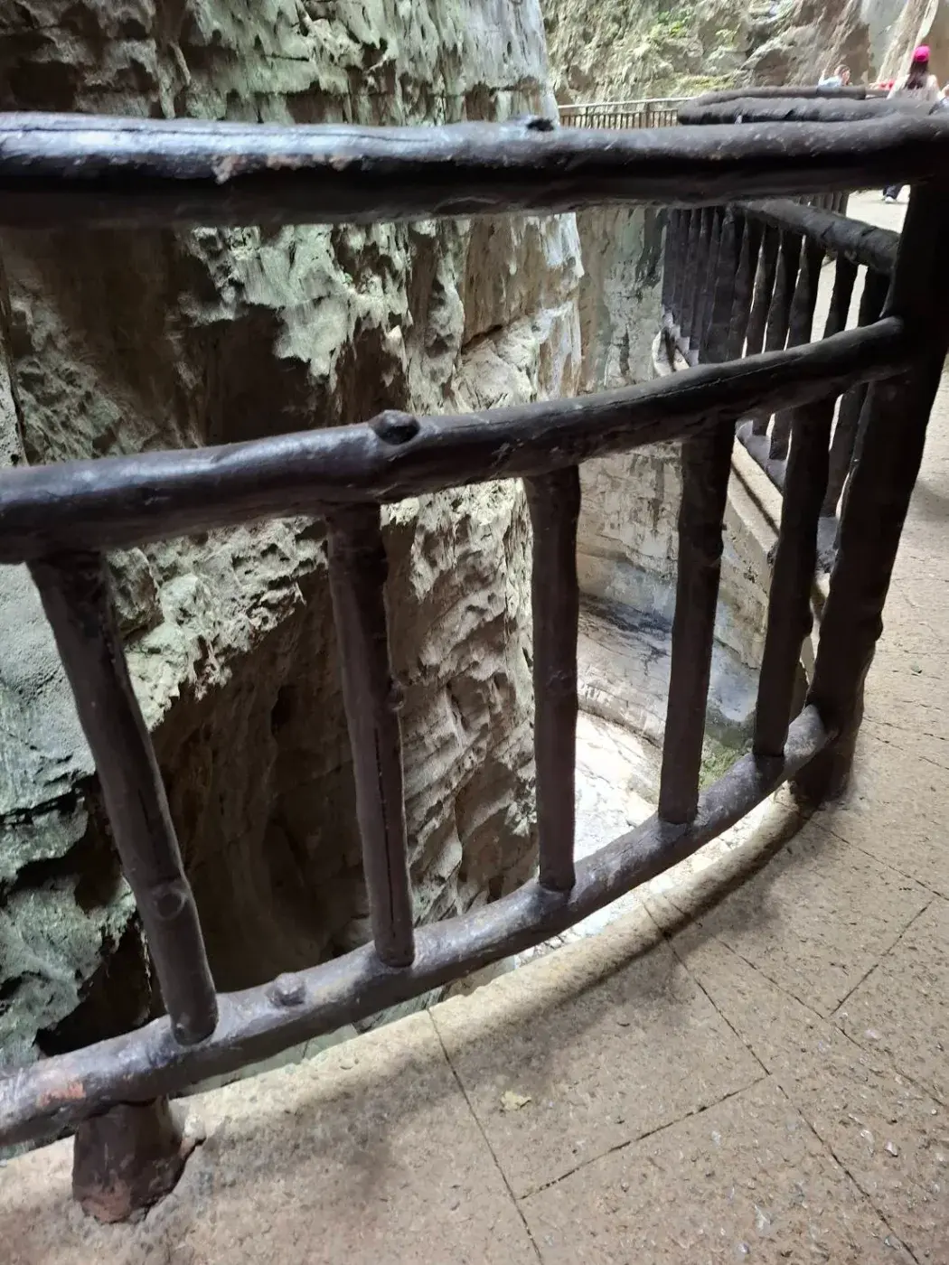 หลังจากที่เราเข้าสู่พื้นที่ ที่เป็นรอยแยกจริงๆ แล้ว ความรู้สึกกลัวก็บังเกิดค่ะ คนไม่กลัวความสูงก็ไม่เป็นไรนะคะ เพราะทางเดิน มันจะถูกแบ่งออกเป็น 2 ส่วนตามรอยแยกค่ะ (ลักษณะเหมือน ภูเขา ที่ถูกแบ่งออกเป็น 2 ส่วน) ด้านขวาจะเป็นทางเดิน เดินได้ทีละคน มีราวกั้นไม่ให้ตกลงไป ราวกั้นแข็งแรงค่ะ ทางเดินจะคดเคี้ยวไปตามแนวของภูเขาไปเรื่อยๆ ส่วนอีกฝั่งคือ หน้าผาล้วนๆ สูงและใหญ่มาก โดยปกติแล้ว ถ้าเป็นช่วงที่ฝนตก ด้านล่างบางช่วงเขาว่าจะมีธารน้ำด้วย แต่ช่วงนี้ มีแต่ก้อนหิน ขนาดใหญ่