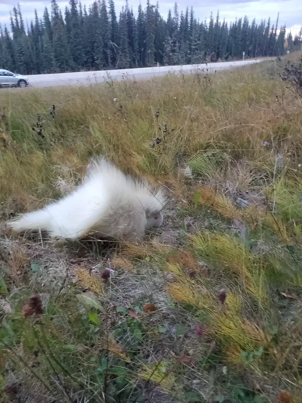 พอรถชะลอและถอยกลับไปใกล้ๆ เท่านั้นแหละ ทั้งคู่ถึงกับอึ้ง สิ่งสีขาวที่เห็นไม่ใช่ก้อนหิน ไม่ใช่ขยะ แต่คือ “เม่นเผือก” ของจริง สัตว์หายากมาก ชนิดที่ว่าพบได้ประมาณหนึ่งในหมื่นตัว ขนและหนามของมันขาวล้วนตั้งแต่หัวจรดหาง ตัดกับสีเขียวและน้ำตาลของป่ารอบๆ แบบเด่นจนเหมือนหลุดมาจากโลกแฟนตาซี