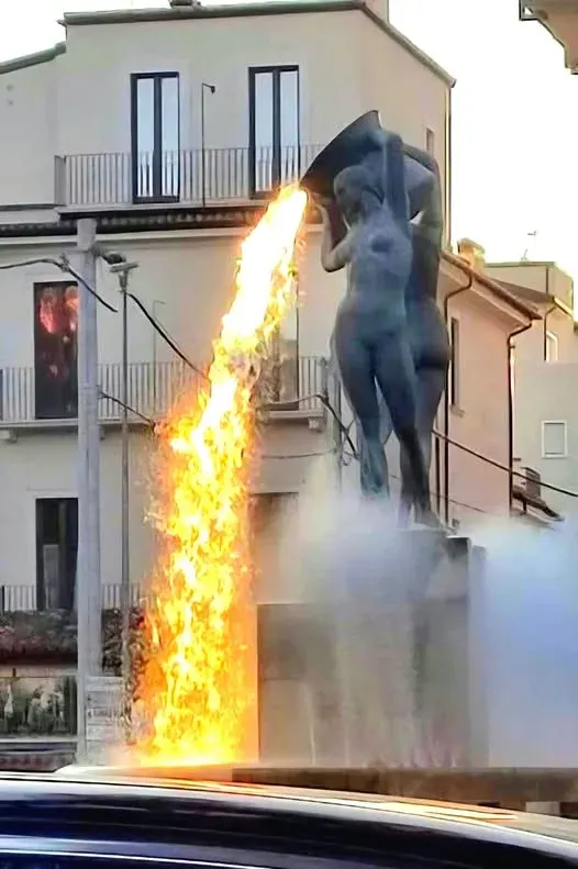 จุดที่สะดุดตามากที่สุดคือรูปปั้นผู้หญิงเปลือยสองนางที่ทำจากบรอนซ์ กำลังช่วยกันประคองถาดขนาดใหญ่ไว้บนศีรษะ ถาดนั้นเรียกว่า Conca Abruzzese เป็นภาชนะตักน้ำแบบดั้งเดิมของชาวอาบรุซโซ พอรู้ความหมายแล้วจะรู้สึกเลยว่านี่ไม่ใช่แค่ประติมากรรมสวยๆ แต่มันสื่อถึงรากวัฒนธรรมของผู้คนในพื้นที่ด้วย