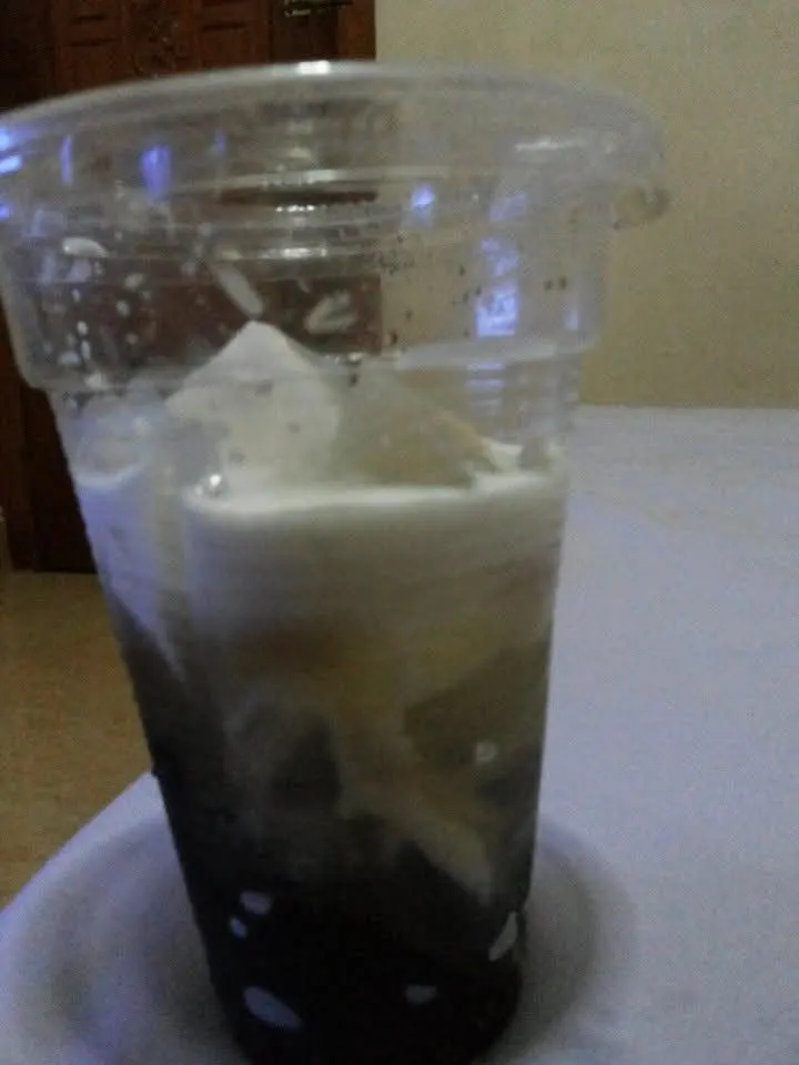 สิ่งที่เขานั้นใส่ให้เราคือ ใส่แก้วพลาสติก พอเห็นเขาหยิบเรานั้นเริ่มมองแล้วไม่ใช่แล้ว จะได้อย่างไร ทำไมใส่แก้ว หันมาถามเขาบอกว่าใส่แก้วนี่ละ มากกว่ากว่านั้นคือใส่น้ำแข็งให้เราด้วย นอกจากนั้นยังนำในส่วนของกะทิสดราดลงไป ตอนนั้นได้แต่ยืนมองและงง จะนำมาผสมกันทำไมเพราะอะไร