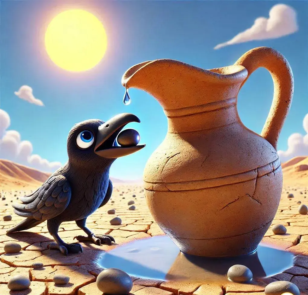 ในวันที่อากาศร้อนจัด เจ้ากาน้อยตัวหนึ่งกำลังกระหายน้ำอย่างมาก ปีกของมันเริ่มอ่อนแรงลงทุกที มันจึงหยุดพักใต้ต้นไม้ มันหันไปเห็นเหยือกน้ำขนาดใหญ่วางอยู่แต่ในน้ำนั้นมีอยู่แค่ก้นเหยือก ซึ่งมันไม่สามารถเอาจะงอยปากของมันลงไปกินน้ำได้ ระหว่างที่เจ้ากากำลังคิดหาวิธีที่จะกินน้ำในเหยือกนั้น สายตาของมันก็เหลือบไปเห็นก้อนหินมากมายบนพื้น มันจึงค่อย ๆ คาบก้อนหินใส่ลงไปในเหยือกน้ำ น้ำก็ค่อย ๆ สูงขึ้น ๆ จนมาถึงปากเหยือก เจ้ากาน้อยแสนฉลาดจึงได้กินน้ำอย่างง่ายดาย