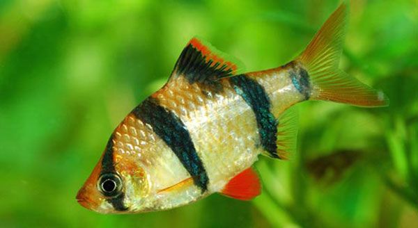 ปลาเสือสุมาตรา (Tiger Barb): มีลายขวาง ลำตัวสีเหลืองทอง นิสัยค่อนข้างซน ชอบไล่ตอดปลาอื่นที่มีครีบยาว