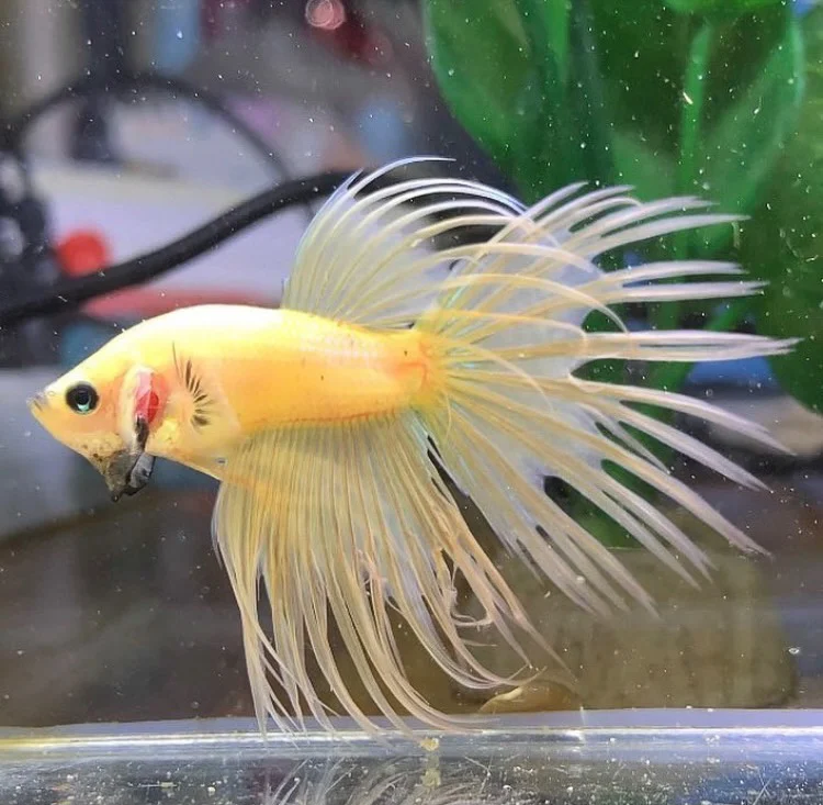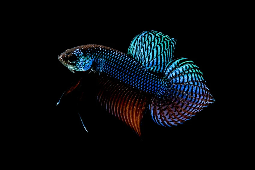 ปลากัดคราวน์เทล หางมงกุฎ ก้านครีบห่างมีลักษณะหางเหมือนแฉกมงกุฎแหลม จัดเรียงกันอย่างสวยงาม