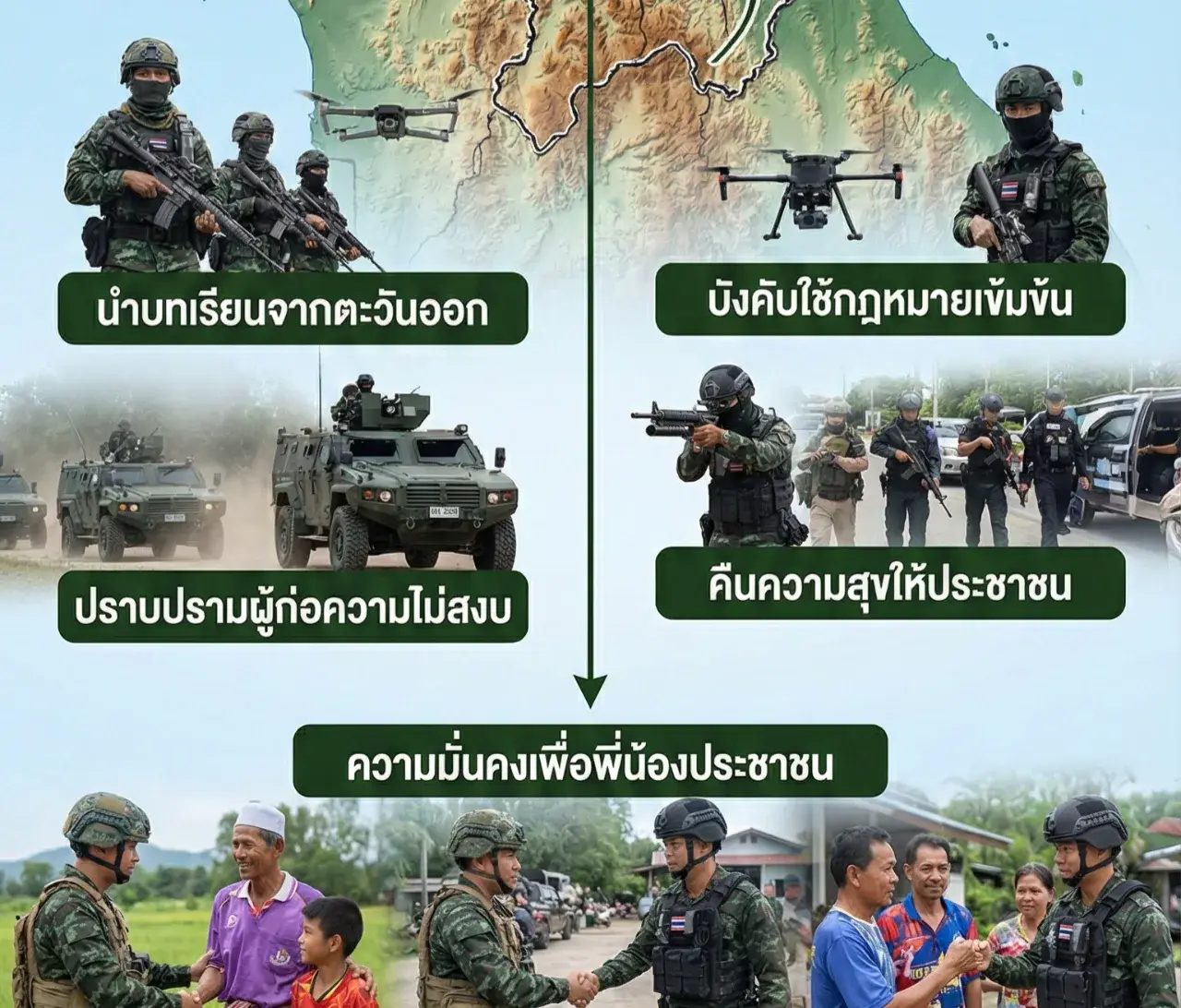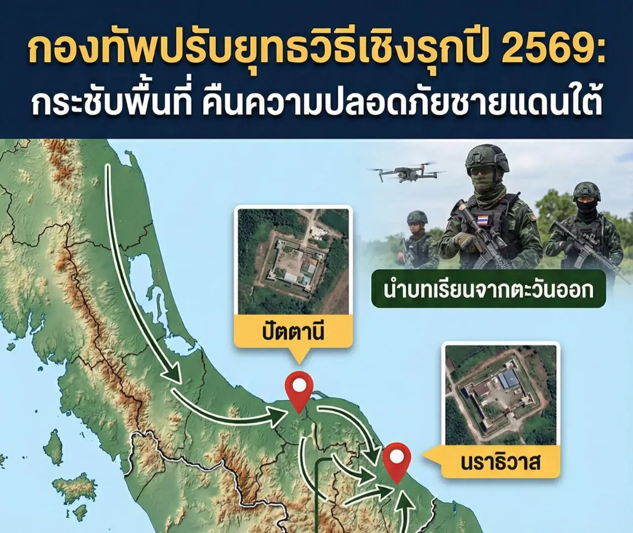 คำว่าเชิงรุกในที่นี้ ไม่ได้หมายถึงการใช้กำลังเข้าห้ำหั่นแบบสงครามเต็มรูปแบบนะครับ แต่หมายถึงการ "กระชับพื้นที่" และ "การบังคับใช้กฎหมายที่เข้มข้นขึ้น" (Law Enforcement) โดยนำบทเรียนความพร้อมรบจากชายแดนตะวันออก มาประยุกต์ใช้เพื่อกดดันกลุ่มผู้ก่อความไม่สงบ ให้เคลื่อนไหวได้ยากขึ้น