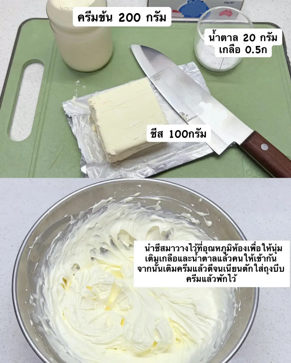 ครีมชีส 100 กรัม, น้ำตาล 20 กรัม, เกลือ 0.5 กรัม, ครีมข้น 200 กรัม