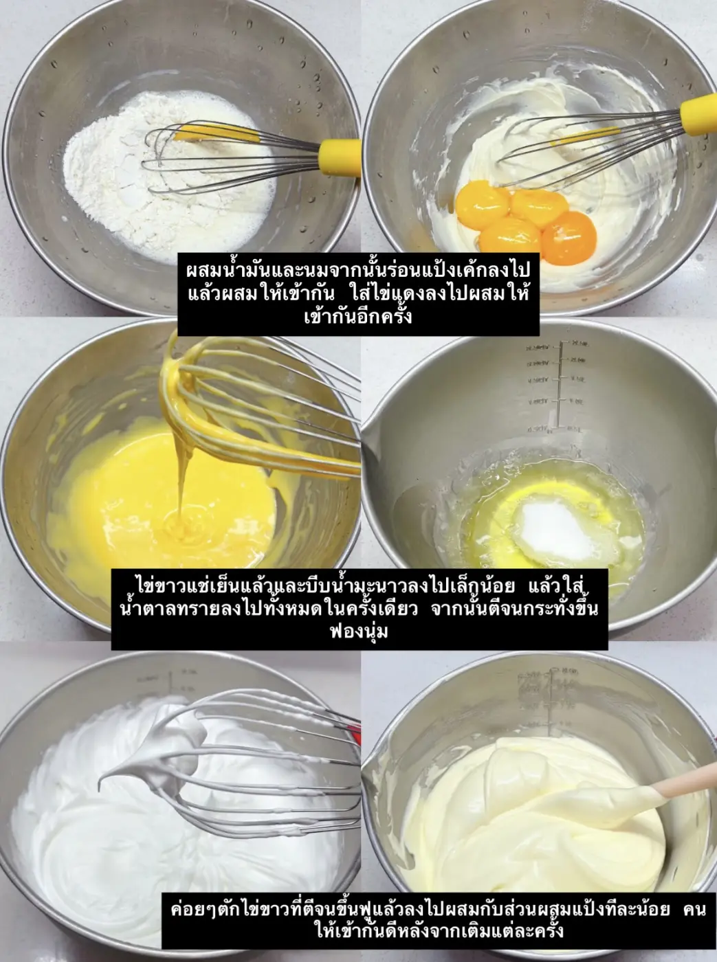 1. ผสมนมและน้ำมันให้เข้ากันดี ร่อนแป้งเค้กลงไป ผสมให้เข้ากัน จากนั้นใส่ไข่แดงและผสมให้เข้ากันอีกครั้ง