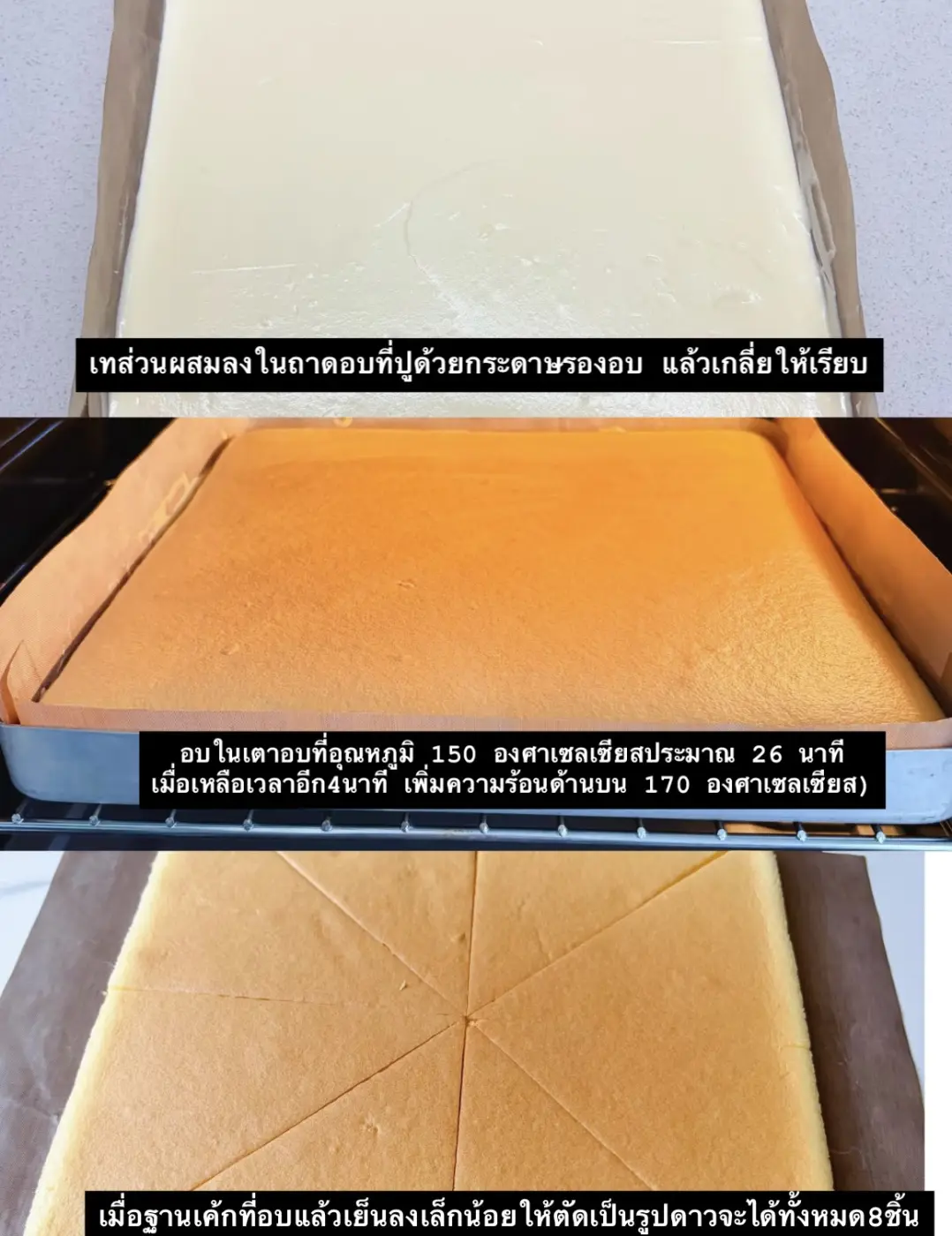 3. นำเข้าอบในเตาอบที่อุณหภูมิ 150 องศาเซลเซียส เป็นเวลา 26 นาที (เพิ่มความร้อนด้านบนเป็น 170 องศาเซลเซียส เมื่อเหลือเวลาอีก 4 นาที หรือจนกว่าด้านบนจะเป็นสีน้ำตาลทองเกือบทั้งหมด)