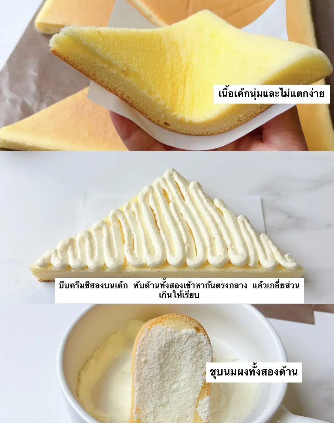 5. ปล่อยให้เค้กโรลที่อบแล้วเย็นลงจนอุณหภูมิพอดีมือ จากนั้นตัดเป็น 8 ชิ้นในลักษณะ รูปดาว นำเค้กฐานหนึ่งชิ้น บีบครีมชีสลงบนผิวหน้า พับด้านข้างทั้งสองเข้าหากันตรงกลาง ขูดชีสส่วนเกินออก แล้วโรยนมผงให้ทั่วทั้งสองด้าน