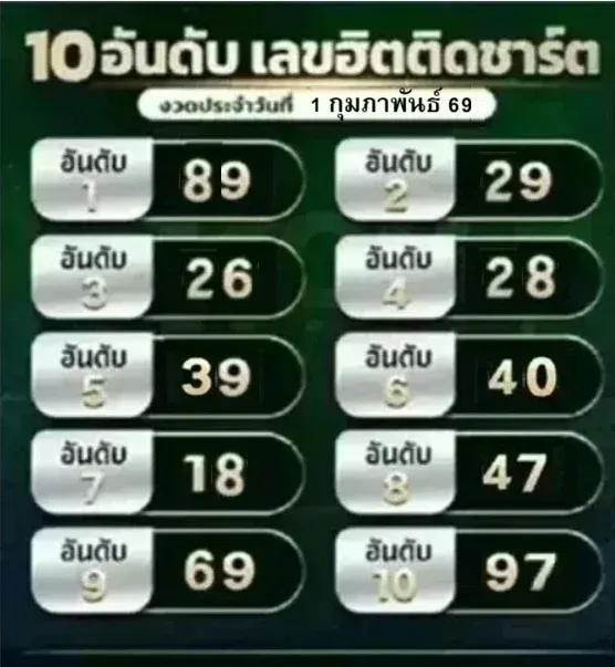 มาแล้ว! "10 อันดับ เลขฮิตติดชาร์ต" งวดวันที่ 1 กุมภาพันธ์ 69..เลขไหนฮิต ส่องเลย!