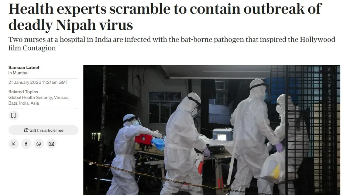 สถานการณ์สาธารณสุขในอินเดียกลับมาตึงเครียดอีกครั้ง เมื่อมีการยืนยันการระบาดของ "ไวรัสนิปาห์" ในรัฐเวสต์เบงกอล ซึ่งถือเป็นการกลับมาอุบัติซ้ำในพื้นที่นี้เป็นครั้งแรกในรอบเกือบ 2 ทศวรรษ เชื้อร้ายตัวนี้ขึ้นชื่อเรื่องอัตราการเสียชีวิตที่สูงลิ่วและความรุนแรงที่ทำลายระบบประสาทโดยตรง ท่ามกลางการเฝ้าระวังอย่างใกล้ชิดจากเจ้าหน้าที่สาธารณสุขทั่วโลกเนื่องจากยังไร้วัคซีนและยารักษาเฉพาะทาง