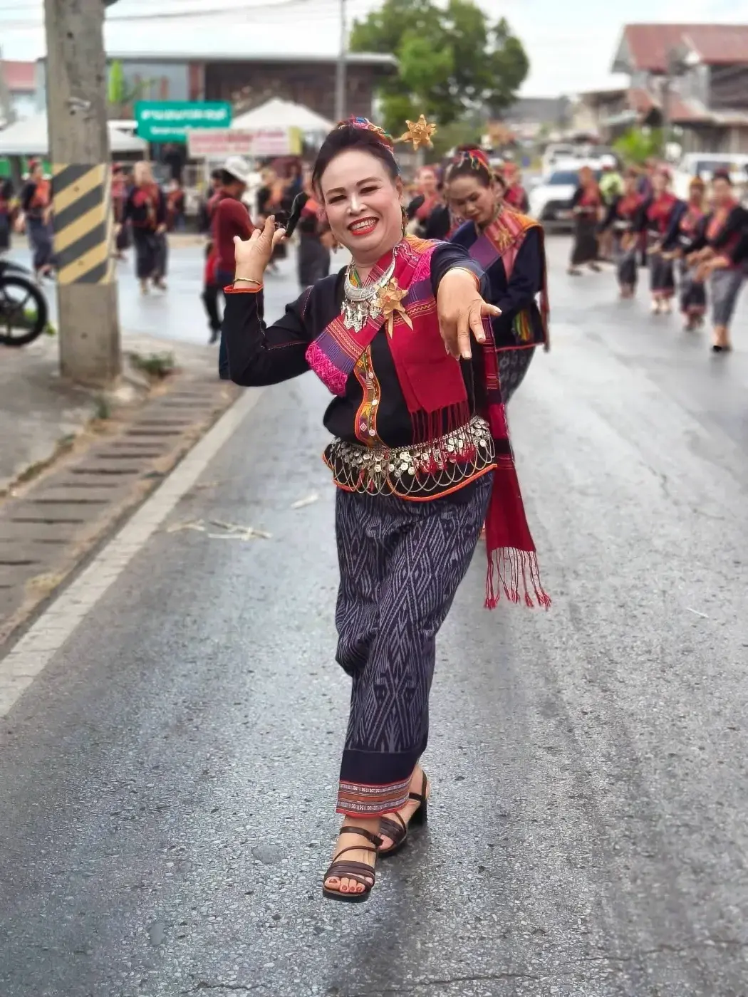 ความสุขนั้นใส่สไบลายแดงแพรฟ้อยบนหัว