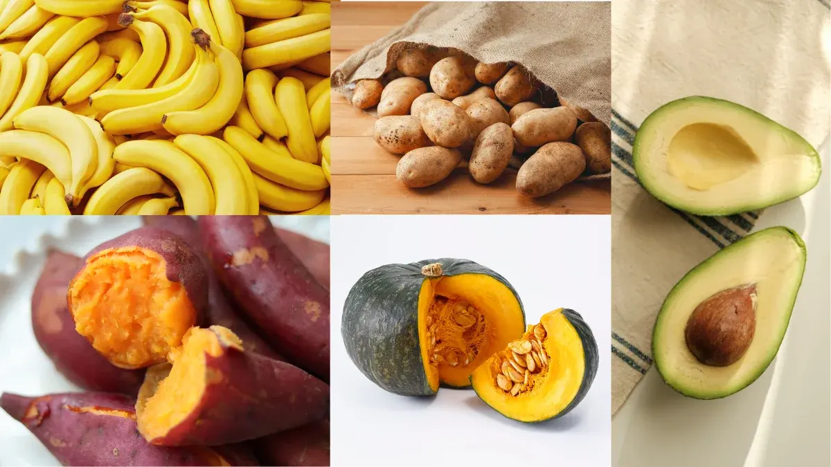 1.กล้วย มีโพแทสเซียมและเส้นใยสูงด้วย ย่อยง่าย ช่วยป้องกันภาวะโลหิตจาง ซึ่งเป็นสภาวะที่เกิดขึ้นเมื่อขาดเซลล์เม็ดเลือดแดง หรือ ฮีโมโกลบิน เป็นแหล่งโพแทสเซียมที่ดี ให้แมกนีเซียมและแคลเซียม สามในสี่ของสารอาหารที่ต้องการ เพื่อบรรเทาอาการตะคริวของกล้ามเนื้อ