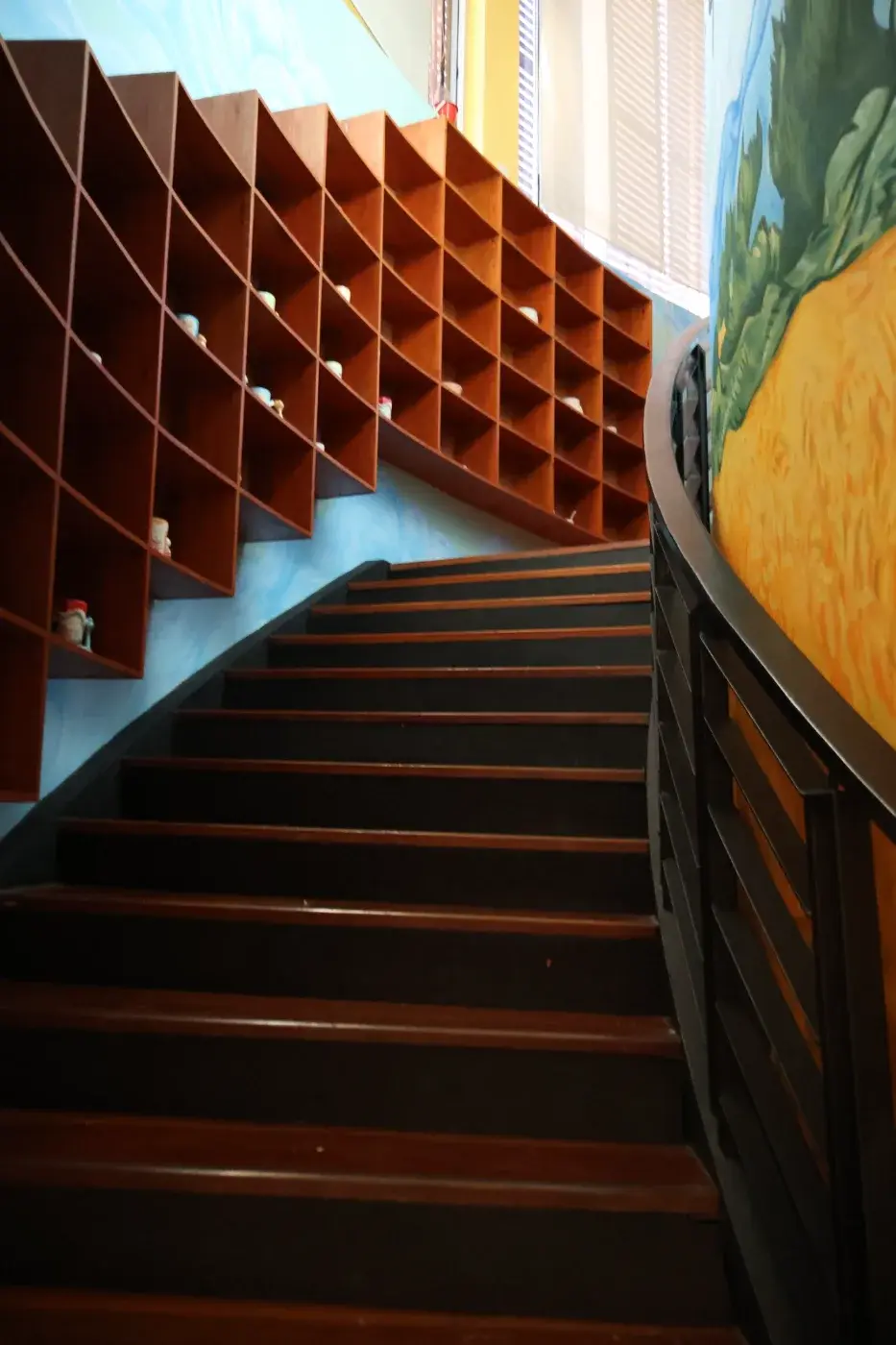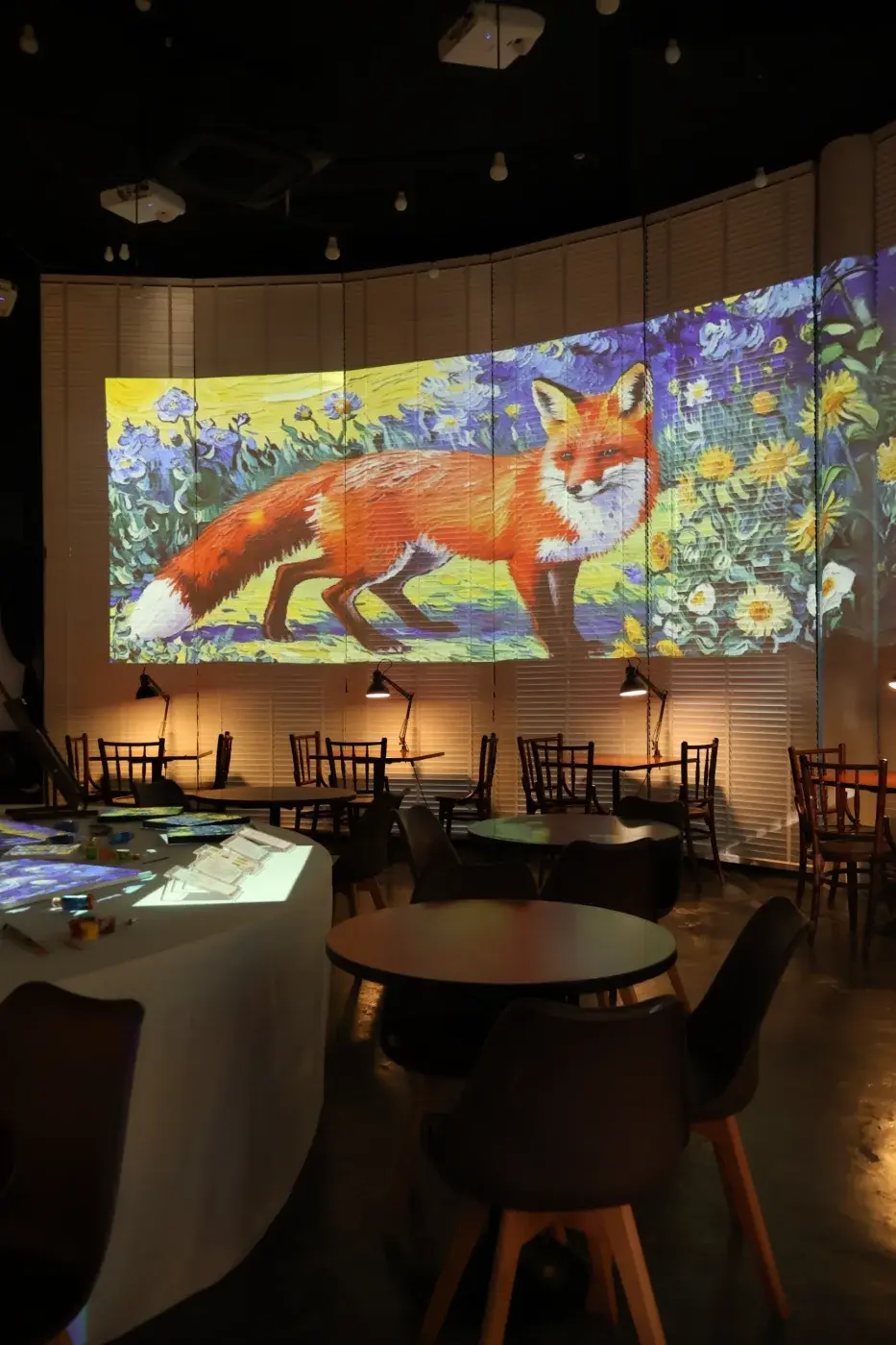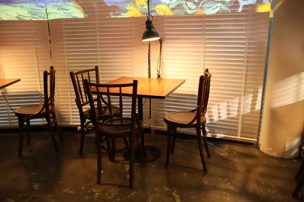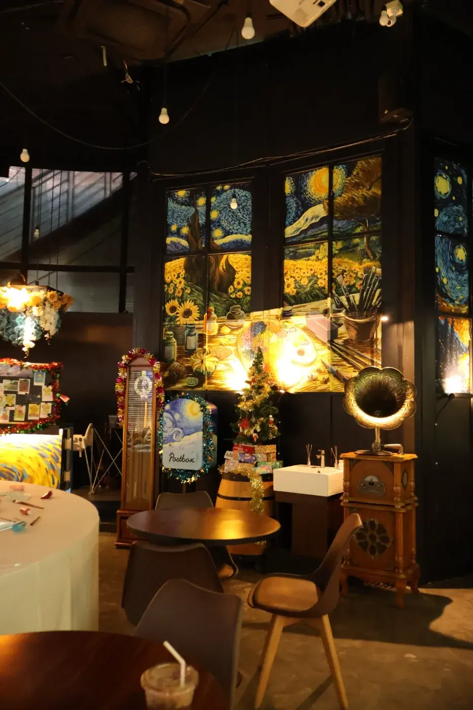 ก้าวแรกที่เดินเข้าไปในร้าน ความรู้สึกเหมือนเราหลุดเข้าไปอยู่ในโลกของ วินเซนต์ แวนโก๊ะ เลยค่ะ ร้านตกแต่งได้สวยสะดุดตาด้วยโทนสีน้ำเงิน-เหลือง ซึ่งเป็นสีหลักของภาพวาดชื่อดัง บรรยากาศข้างในโปร่งสบาย แบ่งพื้นที่ออกเป็น 2 ชั้นอย่างชัดเจน จุดไฮไลต์ที่ห้ามพลาดเลยคือโซนที่ฉายภาพงานศิลปะเคลื่อนไหวแบบ 180 องศาที่ผนังร้านครับ เขาจะเปลี่ยนภาพไปเรื่อยๆ ผสมผสานเรื่องราวของแวนโก๊ะเข้ากับแลนด์มาร์คของไทยอย่างองค์พระปฐมเจดีย์ มันดูเพลินจนลืมเวลาเลยล่ะ แสงสีเสียงในร้านทำออกมาได้ละมุนมาก แอร์เย็นฉ่ำ มีเพลงคลอเบาๆ ช่วยให้รู้สึกผ่อนคลายจากความเหนื่อยล้าได้ดีจริงๆ