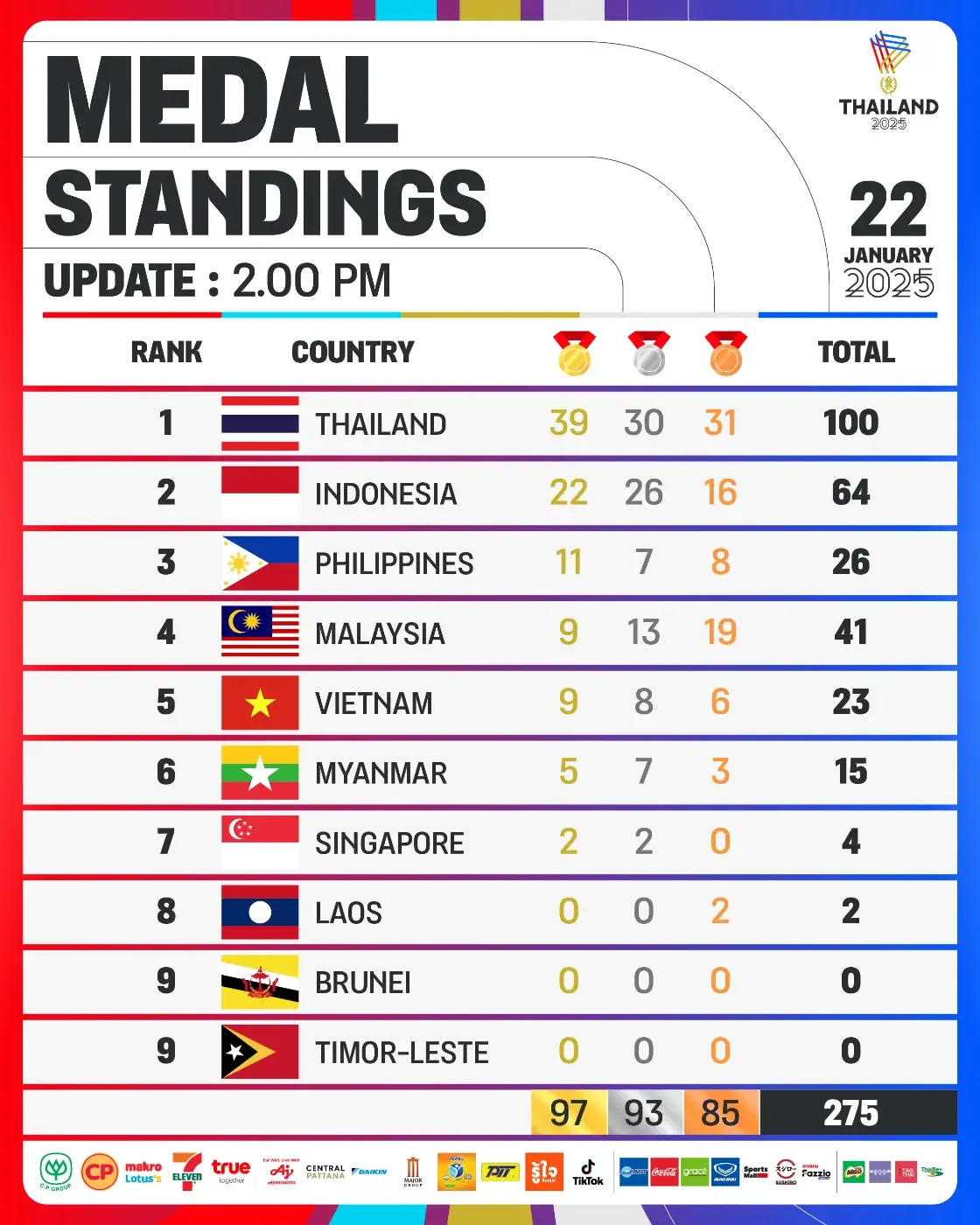 - ฟิลิปปินส์: แซงขึ้นอันดับ 3 ของตาราง โดยได้เหรียญทองจาก มาเอ แองเจล โอทอม ในรายการว่ายน้ำฟรีสไตล์ 100 เมตร หญิง
