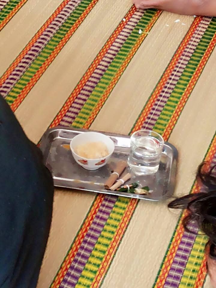 สิ่งที่ต้องเตรียมคือในส่วนของอาหาร ไมจีบขุยยา เตรียมว่าสำหรับบรรพบุรุษที่ได้เรียกมาถาม มีพาหวานหรือว่าอาหารหวานสำหรับถวาย น้ำที่ใสาในแก้วนั้นคือน้ำเปล่า เตรียมไว้ก่อนที่จะทำพิธีการเรียก