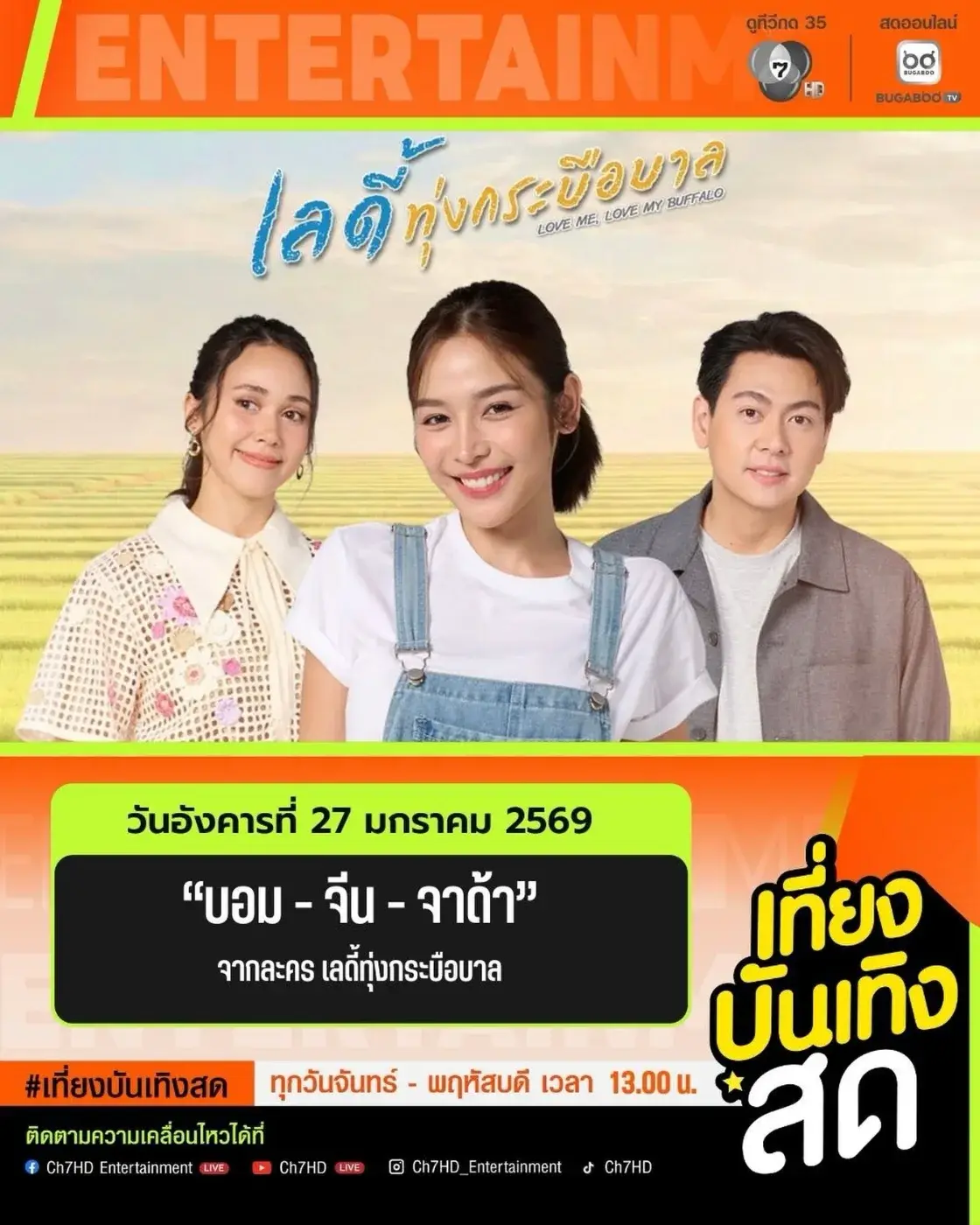 #เที่ยงบันเทิงสด วันนี้ มาพูดคุยสนุก ๆ กับนักแสดงจากละคร #เลดี้ทุ่งกระบือบาล บอม พงศกร / จีน เฌอตินท์นารา และจาด้า อินโตร์เร 😍 เจอกันเวลาบ่ายโมงตรง
