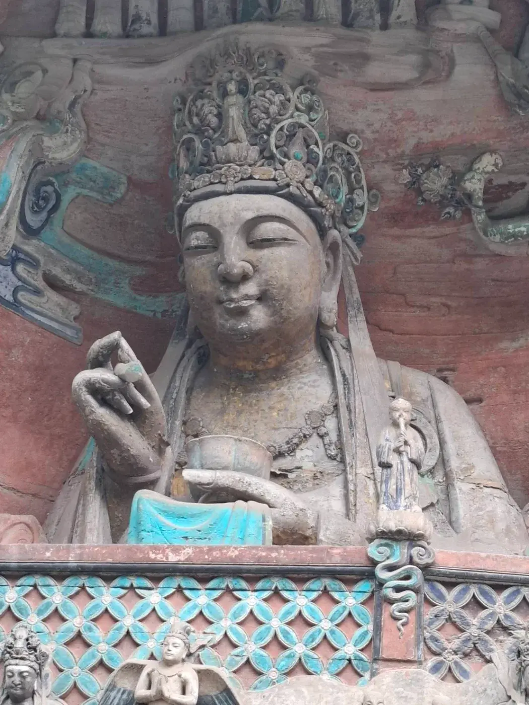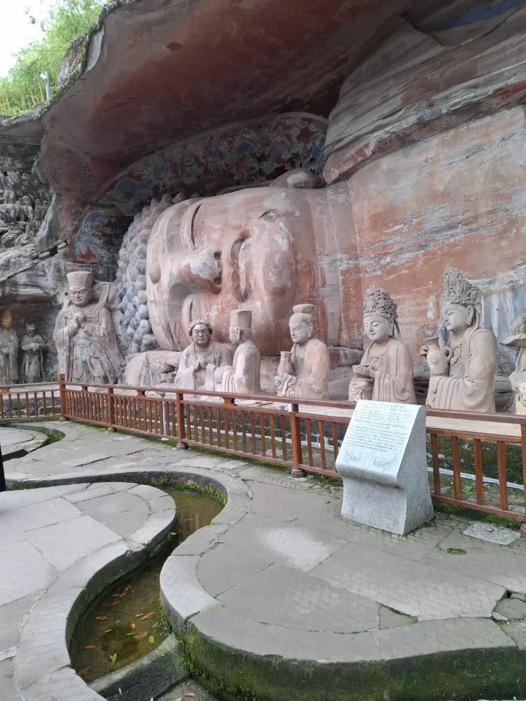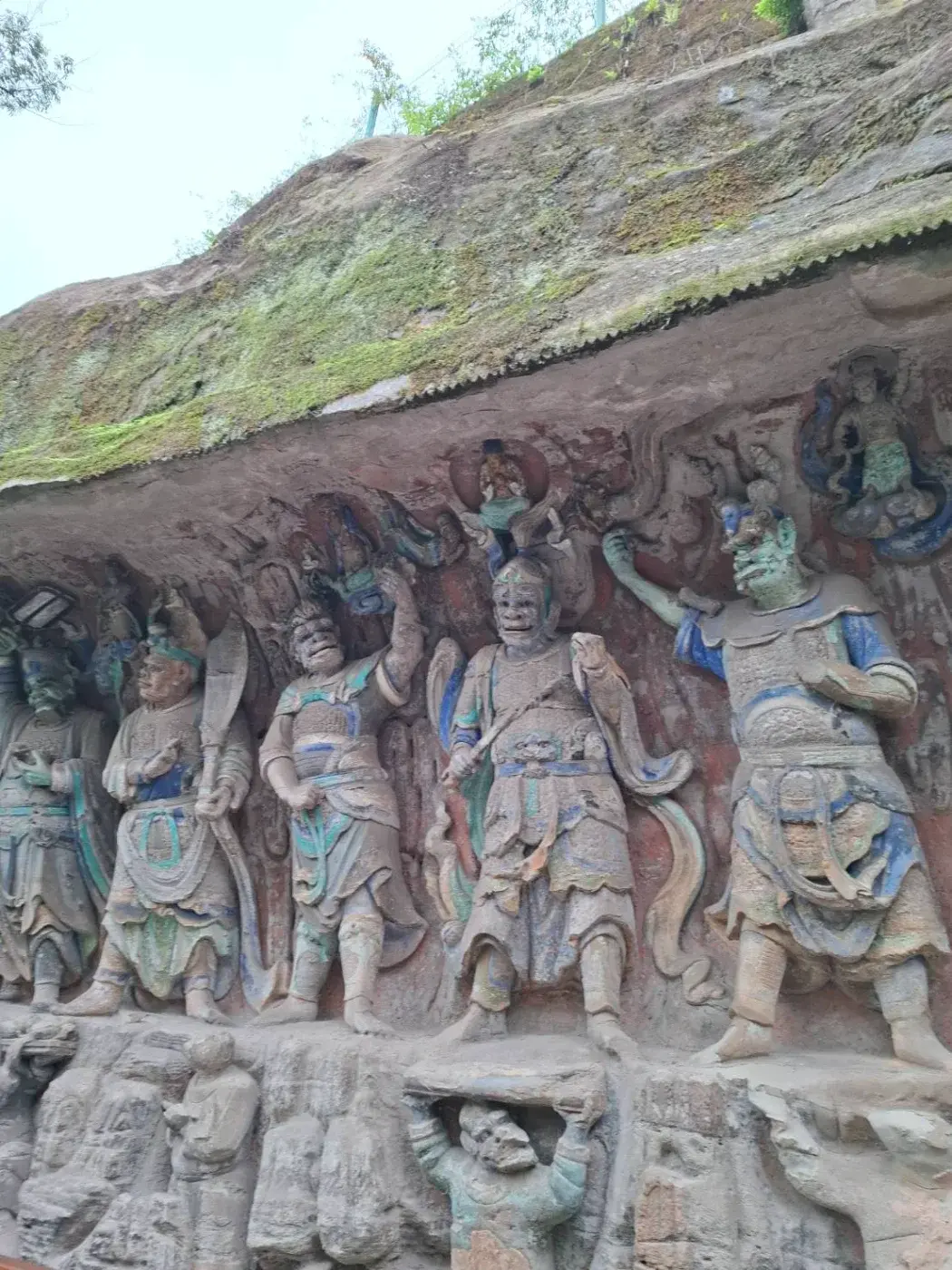 และในที่สุด เราก็เดินทางถึง ผาหินแกะสลัก ที่งดงาม อลังการงานสร้าง แรกเห็นก็ต้องร้อง ว้าวววว ผาหินแกะสลักต้าจู๋ เขาเป่าติงซาน อายุกว่าพันปี เป็นการแกะสลักเรื่องราวเกี่ยวกับพุทธศาสนามีพระพุทธเจ้าปางต่างๆ พระโพธิสัตว์ พระอรหันต์ พระและเทวดาในศาสนาเต๋า ลัทธิขงจื๊อ มีมีภาพจำลองนรกภูมิ และการเวียนว่ายตายเกิด รูปปั้น และอักษรแกะสลักนับแสนชิ้น กระจายตามหน้าผา 5 แห่ง มีพระนอนองค์ใหญ่ที่งดงาม และมีชื่อเสียงมากจากพระโพธิสัตว์พันมือสีทองอร่ามตา ได้ภาพจากผาแกะสลักนี้มากกว่า 300 ภาพ สวยจริงๆ