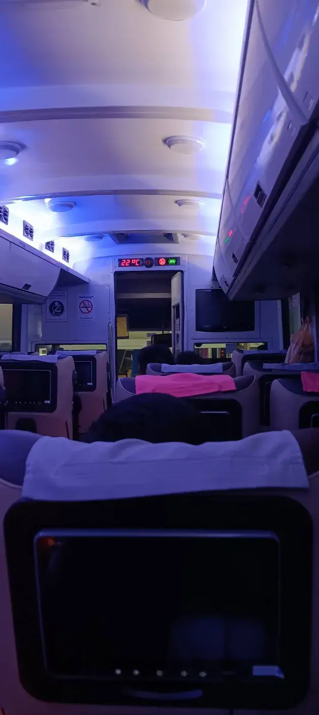 บรรยากาศในการเดินทางตอนค่ำคืนนั้นในห้องผู้โดยสารนั้นดีเพราะว่าแสงนั้นไม่ค่อยที่จะจ้ามากเท่าไหร่ สาารถที่จะกล่อมตนเองนั้นให้หลับได้ด้วยแสงสีน้ำเงินสบายตา บรรยากาศนั้นเงียบนอกจากนั้นในส่วนของผ้าห่มหรือว่าหมอนนั้นมีความสะอาด สบายมากในการเดินทาง ชอบและหลับสนิทเพราะว่ารถนั้นวิ่งเบามาก ไม่เร็วหรือว่าทำให้คนในห้องโดยสารต้องนอนหลับๆ ตื่นๆ