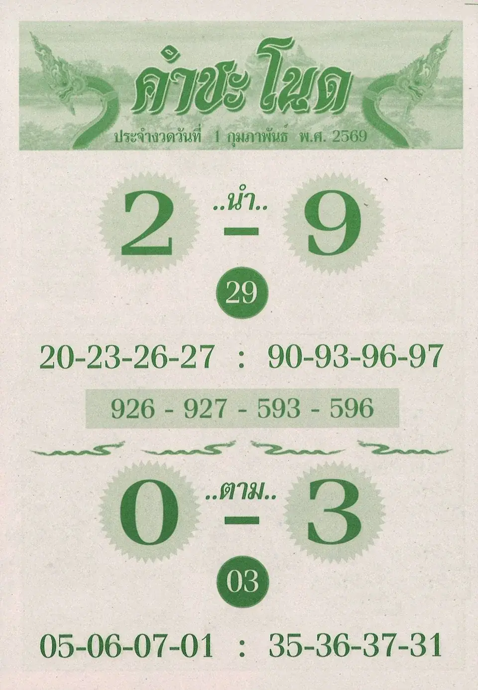 เลขเด็ด "คำชะโนด (ปกเขียว)" งวดวันที่ 1 กุมภาพันธ์ 69..ส่องเลย เลขไหนมาแรง!! สวัสดีครับพี่น้องนักเสี่ยงโชคสายพญานาคทั้งหลายสำหรับใครที่อยากรวย และถูกหวยงวดนี้ เรามีเลขเด็ดดีๆ มาให้ชมกันอีกแล้ว ทั้งนี้ก็สรรหาแต่เลขเด็ดดังๆ เลขไหนที่มาแรงแซงทางโค้ง และโดนใจเหล่าเซียนหวย เราก็ไม่รอช้ารีบคว้าข้อมูลมาเสิร์ฟกันให้ถึงที่ สรรหาแต่สิ่งดีๆ มาฝากกันอีกเช่นเคย ทั้งบรรดาเลขเด็ดจากคนดัง เลขเด็ดจากโซเชียล รวมไปถึงเลขเด็ดปฏิทินจีน ซึ่งก็เป็นอีกหนึ่งแนวทางที่เหล่าเซียนหวยต่างให้ความสนใจกันเป็นอย่างมาก วันนี้เราเลยรวบรวมเอาลายแทงเลขนำโชคจากคำชะโนด ปู่ศรีสุทโธ และย่าศรีปทุมมา ที่ป่าคำชะโนด อ.บ้านดุง จ.อุดรธานี มาฝากกันอีกเช่นเคย