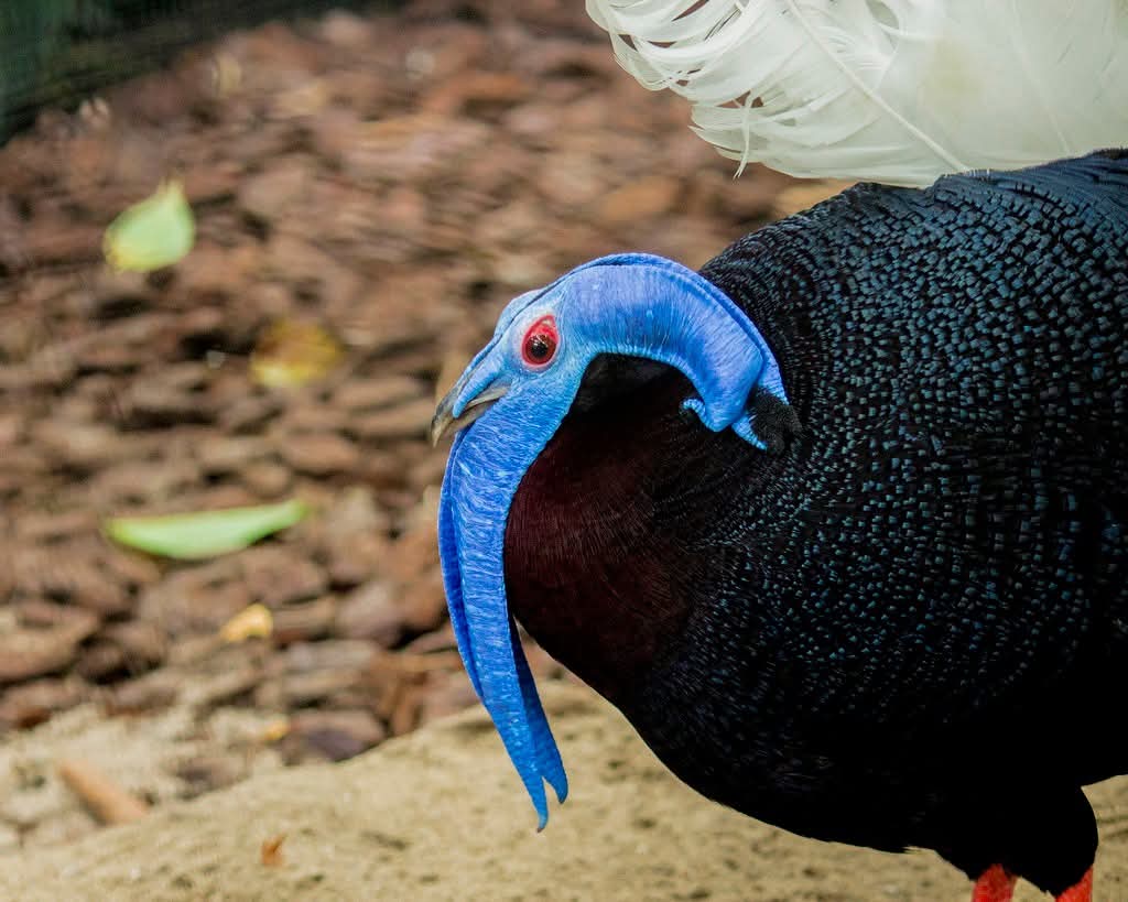 ความโดดเด่นที่สุดอยู่ที่ ตัวผู้ ซึ่งมีผิวหน้าสีน้ำเงินสดจัดจ้าน ราวกับเรืองแสงตัดกับลำตัวสีเข้ม และ หางสีขาวยาวสง่า ที่จะกางออกอย่างอลังการในช่วงฤดูผสมพันธุ์ ✨ การอวดโฉมอันน่าตื่นตานี้คืออาวุธสำคัญในการเกี้ยวพาราสี เพื่อพิชิตใจตัวเมียท่ามกลางผืนป่าเขียวชอุ่ม