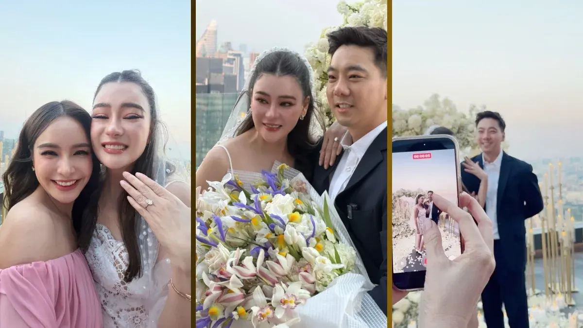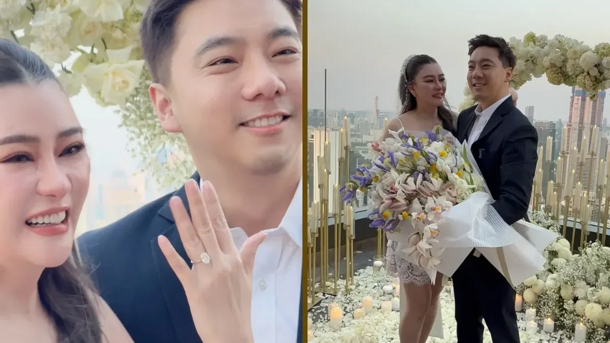 วินาทีที่ฝ่ายชายคุกเข่าลงทำเอา โอ๋ ภัคจีรา ถึงกับกลั้นน้ำตาไว้ไม่อยู่ด้วยความซาบซึ้งใจ ก่อนจะตอบตกลงและโชว์แหวนเพชรเม็ดงามบนนิ้วนางข้างซ้าย ยืนยันสถานะว่าที่เจ้าสาวอย่างเป็นทางการ