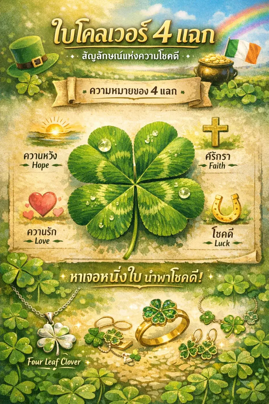 ที่น่าสนใจอีกอย่างคือ ใบโคลเวอร์ 4 แฉก แต่ละแฉกมีความหมายในตัวเอง