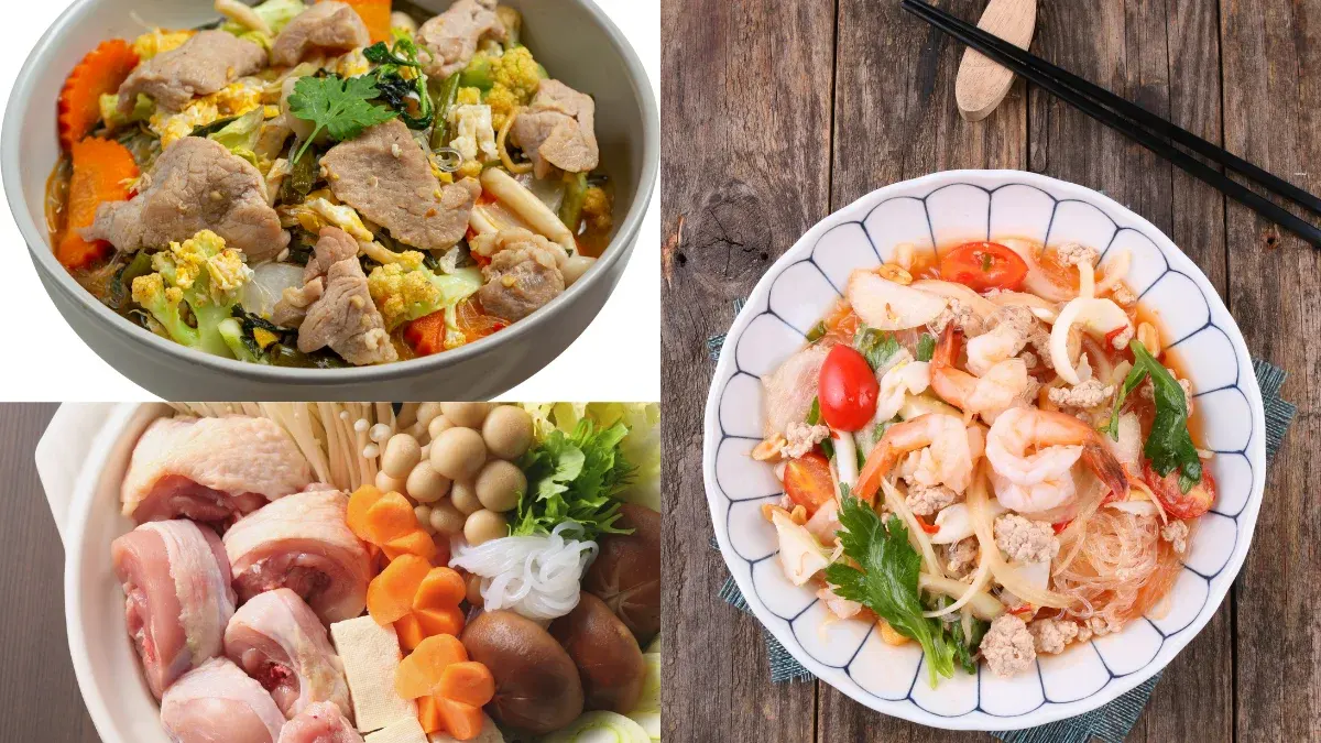 1.สุกี้น้ำ เมนูอาหารจานเดียวที่ครบถ้วนทั้งเนื้อสัตว์ ผัก ไข่ แถมให้แคลอรี่ต่ำ ไม่มีส่วนประกอบของน้ำมัน เลือกสั่งแบบน้ำดีกว่าแบบแห้ง เพื่อลดปริมาณไขมันส่วนเกิน แต่ควรลดการซดน้ำซุปเพื่อลดการเติมโซเดียม และไขมันเข้าร่างกาย เลือกใส่เนื้อหมู ไก่ หรืออาหารทะเลได้ตามความชอบ มีส่วนประกอบของผักหลายชนิด อย่างเช่น ผักกาดขาว เห็ด ข้าวโพดอ่อน ผักบุ้ง และวุ้นเส้น ที่เป็นสารอาหารประเภทคาร์โบไฮเดรตให้พลังงานแก่ร่างกาย สุกกี้น้ำ มักเสิร์ฟคู่กับน้ำจิ้มสุกกี้ ซึ่งอาจมีส่วนผสมของโซเดียมและน้ำตาล จึงควรใส่เพียงเล็กน้อย