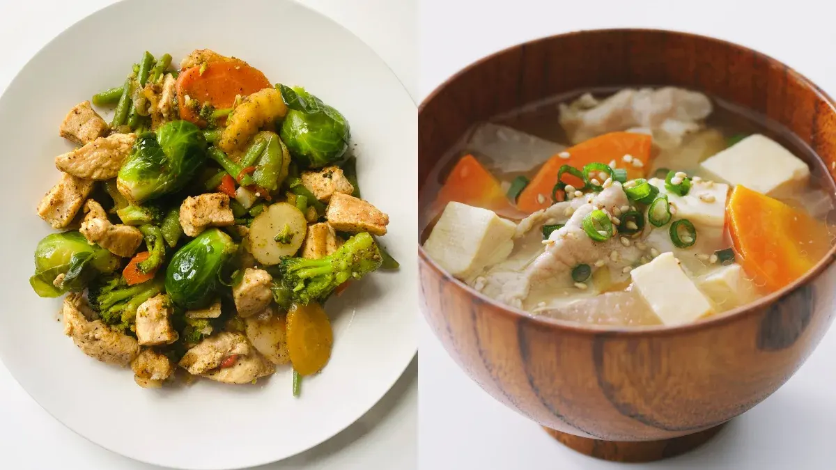 3.ผัดผักรวมมิตร มีส่วนประกอบของผักหลายชนิด อย่างเช่น บล็อคโคลี่ กะหล่ำปลี แครอท ข้าวโพดอ่อน ถั่วลันเตา อาจใส่เนื้อสัตว์ลงไปด้วย อย่างเช่น กุ้ง หมู ไก่ ปลาหมึก เป็นเมนูอาหารที่อุดมไปด้วยสารอาหารประเภทโปรตีน คาร์โบไฮเดรต วิตามินและแร่ธาตุครบถ้วนที่ดีต่อสุขภาพร่างกาย ไม่ทำให้อ้วน สามารถกินเป็นอาหารเช้าและอาหารเย็นได้ ควรลดปริมาณน้ำมันและเครื่องปรุงต่าง ๆ ลง