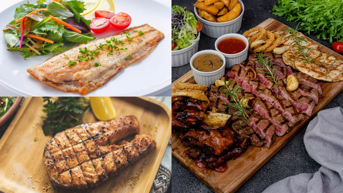 9.สเต๊ก ควรเลือกสั่งเนื้อปลาจะดีที่สุด อย่างเช่น ปลากะพง ปลาดอรี หรือปลาแซลมอน ที่อุดมด้วยโปรตีน และโอเมก้า-3 เป็นกรดไขมันจำเป็นที่ดีต่อการทำงานของสมองและหัวใจ เลือกวิธีการปรุงโดยการย่าง เลี่ยงการทอดช่วยลดไขมัน และให้ทั้งรสชาติที่อร่อยกว่า กินเคียงกับสลัดผักต่าง ๆ หรือผักย่าง เพื่อเพิ่มใยอาหาร ส่วนคาร์โบไฮเดรตอาจเลือกเป็นมันต้ม หรือมันอบ แทนมันทอด ที่ให้ประโยชน์กับร่างกายแบบไขมันต่ำ