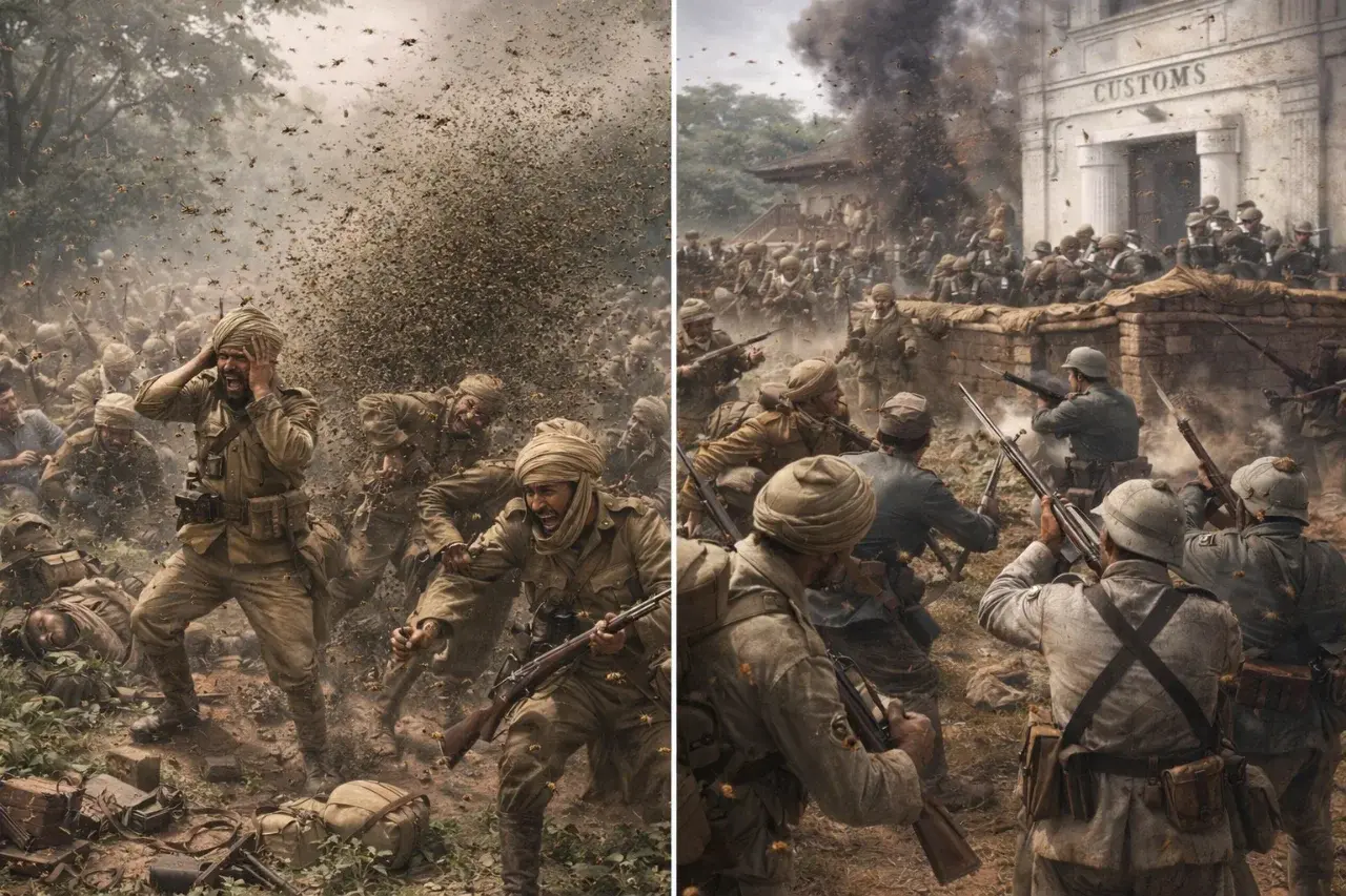 ทันใดนั้นเอง ฝูงผึ้งนับไม่ถ้วนก็แตกฮือออกมาแบบไม่เลือกหน้า ไม่เลือกฝ่าย แต่คนที่โดนหนักสุดกลับเป็นทหารอังกฤษที่ยืนรวมกลุ่มกันแน่น ผึ้งไล่ต่อยไม่ยั้ง ทั้งหน้า ทั้งคอ ทั้งมือ เสียงร้องโวยวายดังระงมไปทั้งแนวรบ