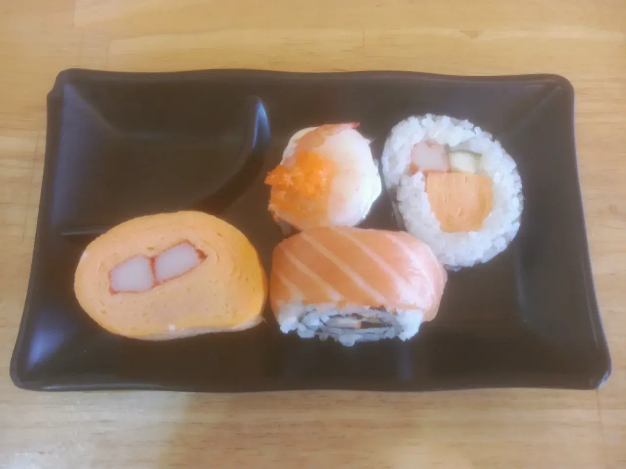 ในร้านไข่หวานบ้านซูชิเขามีหน้าท็อปปิ้งที่จัดเรียงบนข้าวปั้นสวยงามเช่น สาหร่ายญี่ปุ่นสีเขียวที่มีรสชาติกรุบกรอบ,กุ้งซอสเผ็ด,หน้าปลาไหลย่างที่ประกบคู่กับสาหร่ายรสชาติของข้าวจะมีความนุ่มและหอมพอดีคำ