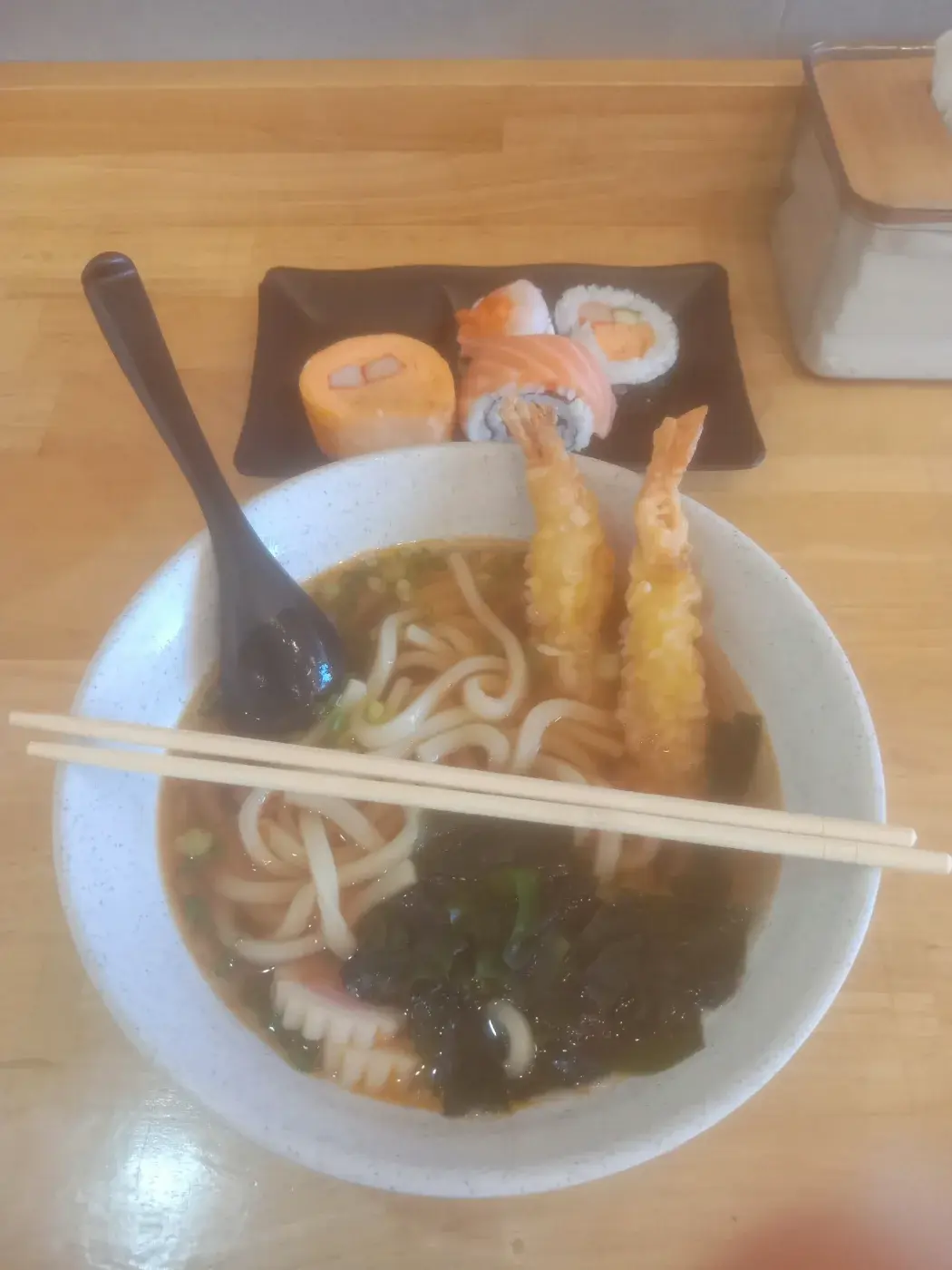 นอกจากนี้ก็ยังมีเมนูอื่นๆอย่างเช่นเมนู ราเมงอุด้งกุ้งเทมปุระที่มีทั้งสาหร่าย เส้นราเมงและกุ้งเทมปุระสองตัวๆใหญ่กรอบๆ มาให้เราลองชิมพร้อมเส้นอุดงราเมนค่ะหรือจะสั่งเมนูซูชิมากินคู่ด้วยจะอร่อยขึ้น