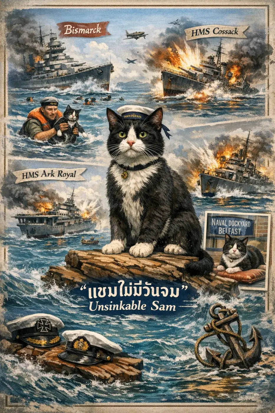 ภาพจำตอนนั้นคือ แมวว่ายน้ำตามทหารอังกฤษติดแจ เหนื่อยก็ไปเกาะซากไม้ลอยน้ำ และแน่นอน… ราชนาวีอังกฤษไม่เคยทิ้งใครไว้ข้างหลัง รวมถึงแมวด้วย 🐾