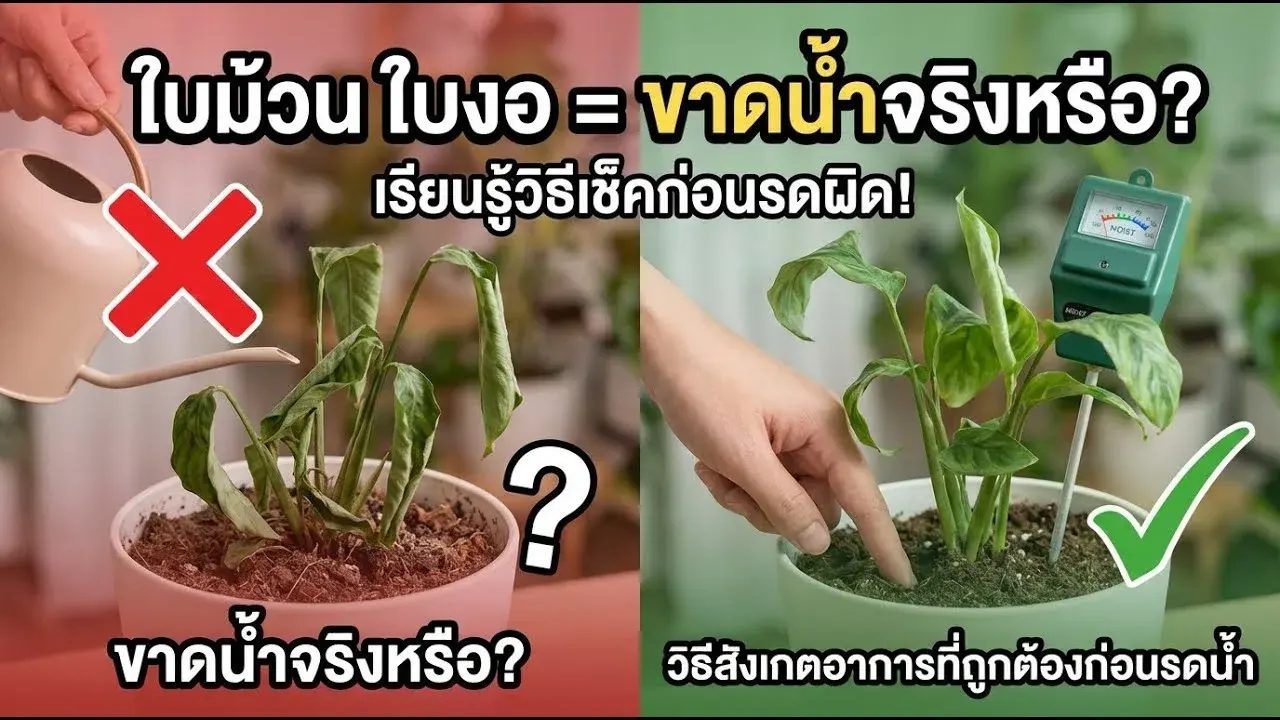 สรุป: ใบห่อม้วนไม่ได้มีสาเหตุจากการขาดน้ำเสมอไป การสังเกตลักษณะใบ สี ก้านใบ สภาพดิน และสภาพแวดล้อมช่วยวินิจฉัยได้ชัดเจน รดน้ำเมื่อจำเป็น ปรับสภาพแวดล้อมและการดูแลตามสาเหตุจริงจะช่วยให้ต้นไม้ฟื้นไวและแข็งแรง