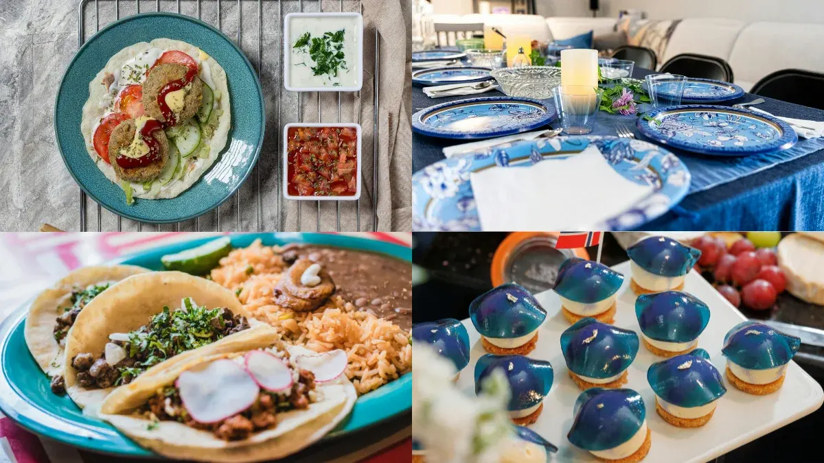 - อุปกรณ์อาหารบนโต๊ะเป็นสีฟ้า จาน ชาม ช้อน ส้อม อุปกรณ์ตกแต่งบนโต๊ะอาหาร อย่างเช่น เชิงเทียน แจกัน กระดาษเช็ดปาก
