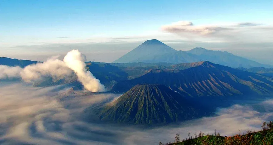 3. ภูเขาไฟโบรโม่ (Mount Bromo), อินโดนีเซีย เป็นภูเขาไฟซอมมา ที่ยังคงปะทุอยู่ เป็นสถานที่แสวงบุญของชาวฮินดูและเป็นส่วนหนึ่งของ เทือกเขา เต็งเกอร์ในชวาตะวันออก ประเทศอินโดนีเซีย ในวันที่ 12 ของเทศกาลฮินดูยาดเนีย กาสา ดา ชาวเต็งเกเรเซแห่งอำเภอโปรโบลิงโกจังหวัดชวาตะวันออกจะเดินทางขึ้นไปบนภูเขาเพื่อถวายผลไม้ ข้าว ผัก ดอกไม้ และปศุสัตว์แด่เทพเจ้าแห่ง ภูเขา โดยการโยนลงไปใน ปล่องภูเขาไฟต้นกำเนิดของพิธีกรรมนี้มาจากตำนานในศตวรรษที่ 15 บนที่ราบทราย ซึ่งชาวบ้านเรียกว่าเซการา เวดี (แปลว่า ทะเลทราย) มีวัดฮินดู ชื่อ ปูรา ลูฮูร์ โปเตน ตั้งอยู่ วัดแห่งนี้มีความสำคัญอย่างยิ่งต่อชาวเต็งเกเรเซ ที่กระจัดกระจายอยู่ตามหมู่บ้าน บนภูเขา