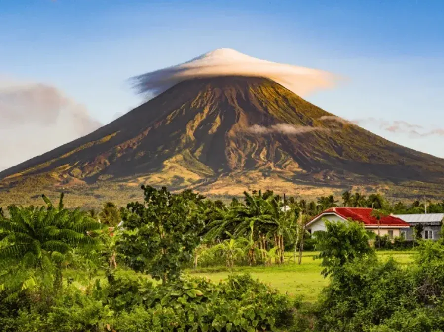 9. ภูเขาไฟมายอน (Mayon Volcano), ฟิลิปปินส์ เป็นภูเขาไฟสแตรโตโวลคาโน ที่ยังปะทุอยู่ ตั้ง อยู่ในจังหวัดอัลบายในภูมิภาคบิโคลประเทศฟิลิปปินส์ เป็นสถานที่ท่องเที่ยวที่ได้รับความนิยม มีชื่อเสียงในเรื่อง "รูปทรงกรวยที่สมบูรณ์แบบ" เนื่องมาจากรูปทรงกรวย สมมาตร และถือเป็นสถานที่ศักดิ์สิทธิ์ในตำนานของฟิลิปปินส์