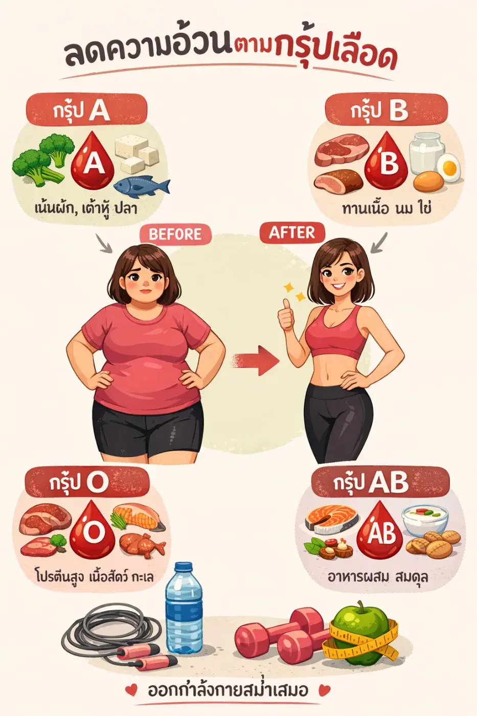 การลดน้ำหนักตามกรุ๊ปเลือด ซึ่งได้รับความนิยมมากในขณะนี้ เนื่องจากมีความเชื่อว่า โปรตีนในอาหารจะทำปฏิกิริยากับเลือดของแต่ละกรุ๊ปที่แตกต่างกันไป หากเราเลือกทานอาหารที่ถูกต้องตามกรุ๊ปเลือดของเราจะช่วยให้ระบบย่อยอาหารดีขึ้นและลดน้ำหนักได้ง่ายขึ้นเช่นกัน