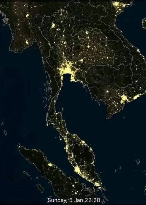 เมื่อมองกว้างออกไป เราจะเห็นแสงไฟเชื่อมต่อไปยังประเทศเพื่อนบ้าน ทางตอนใต้คือมาเลเซีย ส่วนทางขวาของภาพคือจุดสว่างขนาดใหญ่ของโฮจิมินห์ซิตี้ ประเทศเวียดนาม แสดงให้เห็นว่าภูมิภาคเอเชียตะวันออกเฉียงใต้เชื่อมโยงกันด้วยเครือข่ายเมืองและมนุษย์อย่างแน่นแฟ้น