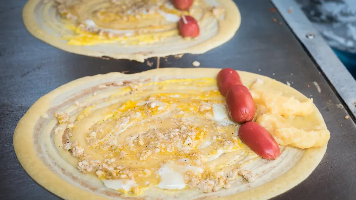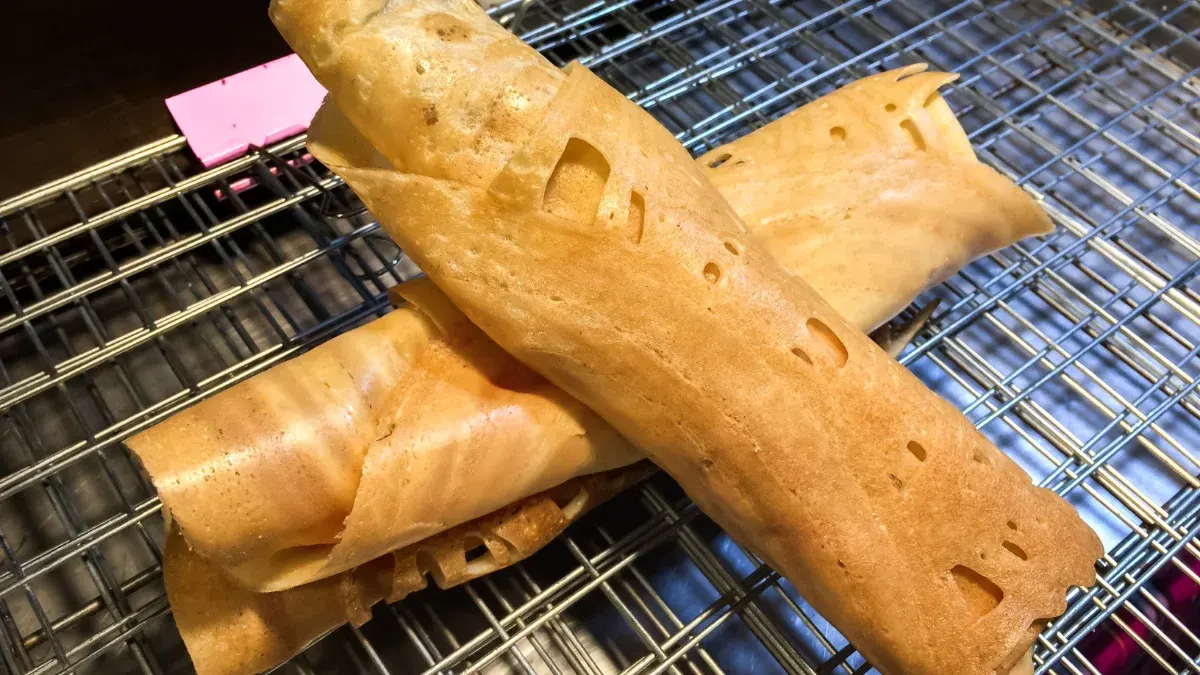 วิธีการห่อ: จากการประกบกัน 2 แผ่นแบบต้นฉบับ เปลี่ยนมาเป็นการ "ม้วน" เพื่อให้ถือรับประทานได้สะดวกขณะเดินเที่ยว