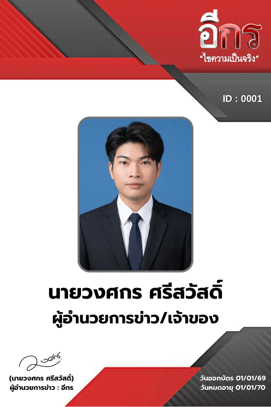 สำนักข่าว : อีกร “ไขความเป็นจริง” “สถานีข่าวเพื่อประชาชน” ทะเบียนเลขที่ 1279900264530 อยู่ในเครือ โปรดักชั่น มีเดีย ออนไลน์ (ไทยแลนด์) ผู้ควบคุมเว็บไซต์ : นายวงศกร ศรีสวัสดิ์ ผู้อำนวยการข่าว/เจ้าของ ติดต่อ 061-592-5801 เพื่อรังสรรค์ผลงานประชาสัมพันธ์ สื่อข่าวสาร ข่าวอาชญากรรม ข่าวภูมิภาค ข่าวเศรษฐกิจ ข่าวสังคม ข่าวการเมือง ข่าวท้องถิ่น ข่าวดัง ข่าวติดกระแส ข่าวมูเตลู ในประเทศไทย ให้กับองค์กรภาครัฐ - เอกชน และประชาชน ได้รับรู้ข้อมูลข่าวสารอย่างทั่วถึง และเข้าใจง่าย และเราได้มีผู้สื่อข่าวคอยรายงานข่าว 77 จังหวัด จึงได้เกิดการก่อตั้ง อีกร “ไขความเป็นจริง” ขึ้นมา สำนักข่าว เราก่อตั้ง วันที่ 1 กันยายน 2567 โดยมีผู้บริหารงานโดย นายวงศกร ศรีสวัสดิ์ ผู้อำนวยการข่าว/เจ้าของ นายบุญเกียรติ มุ้ยแก้ว บรรณาธิการข่าว