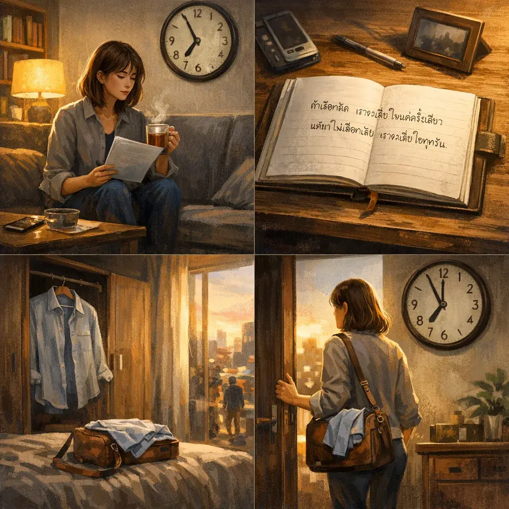 ความรู้สึกไม่ได้โต้แย้ง มันเพียงนิ่งเงียบเหมือนเด็กที่รู้ว่าพูดไปก็ไม่มีใครฟัง ช่วงเย็น แสงแดดเอียงต่ำ สะท้อนฝุ่นในอากาศเป็นเส้นบาง ๆ เธอเปิดหน้าต่าง เสียงรถเมล์ เสียงแม่ค้าตะโกนเข้ามา เสียงหัวเราะของเด็กจากลานข้างตึก ชีวิตยังดำเนินต่อไป โดยไม่สนใจว่าใครจะตัดสินใจอะไร อย่างไร